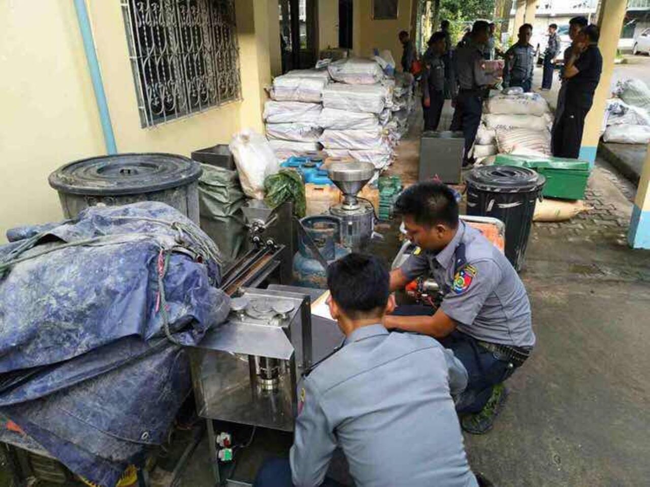 ทหาร ตำรวจ ปปส.ท่าขี้เหล็ก เมียนมา ทลายโรงงานปั้มยาบ้า ได้เครื่องปั้ม ตรายางโลโก้ ยาบ้า 30 ล้านเม็ดยาอี 4 กระสอบใหญ่ คาเฟอีน 7 ถุงใหญ่ เฮโรอีน 24 ก้อน นำหนัก 8 กิโลกรัม ยาไอซ์ 500 กรัม พร้อมผู้ต้องหาชาย 3 หญิง1