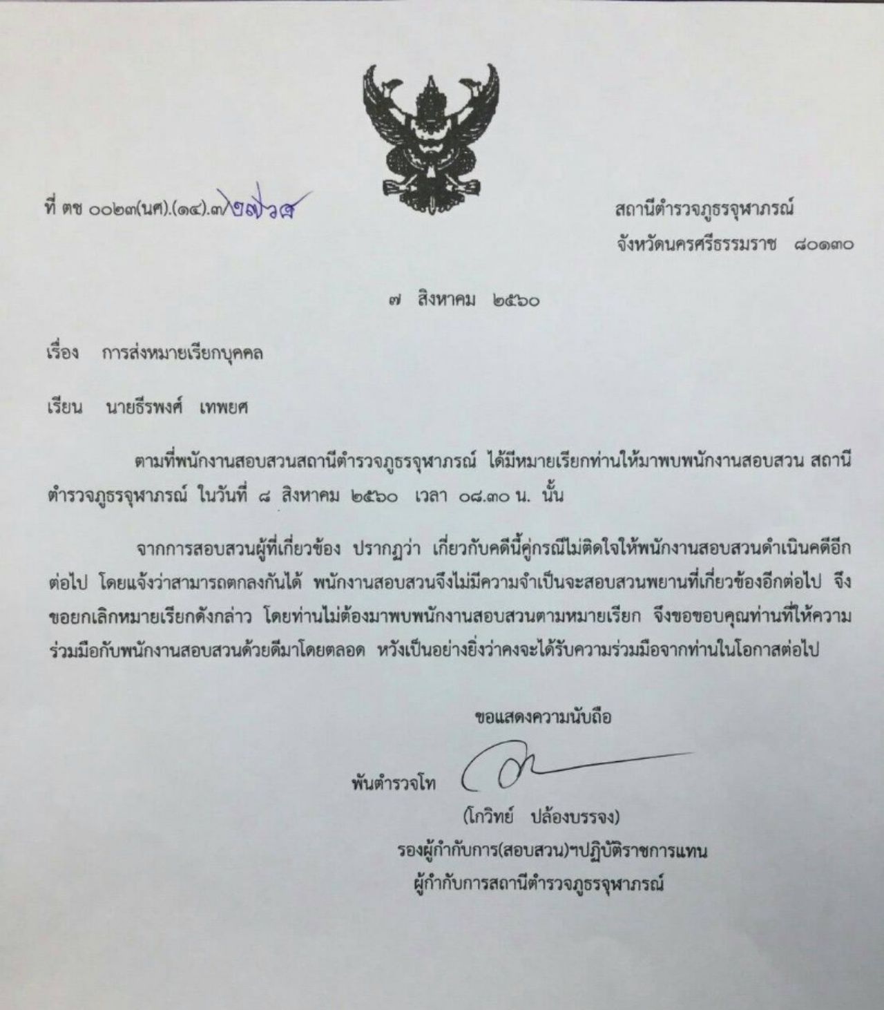ขณะที่ พ.ต.ท.โกวิทย์ ปล้องบรรจง รอง ผกก.(สอบสวน) หัวหน้างานสอบสวน สภ.จุฬาภรณ์ เผยว่า คดีนี้หลังจากมีการแจ้งความร้องทุกข์ เมื่อวันที่ 5 ส.ค. 2560 มีการเจรจากัน ในวันที่ 6 ส.ค. 2560 แม้ว่าจะยังไม่มีข้อยุติทางคดี แต่ในวันที่ 7 ส.ค. 2560 คือวันถัดมา ทางฝ่ายผู้เสียหายได้แจ้งกับพนักงานสอบสวนว่า คู่กรณีสามารถตกลงกันได้แล้ว ตนจึงได้ทำหนังสือถึงผู้ถูกกล่าวหา ว่าไม่ต้องมาพบพนักงานสอบสวนตามหมายเรียกแล้ว แต่ปรากฏว่าเหตุการณ์กลับบานปลาย ถึงขั้นชุมนุมขับไล่ ผกก. ทั้งๆ ที่ได้มีหนังสือแจ้งให้ทราบแล้วว่า ผู้ถูกกล่าวหา ไม่ต้องมาพบพนักงานสอบสวนแล้ว.