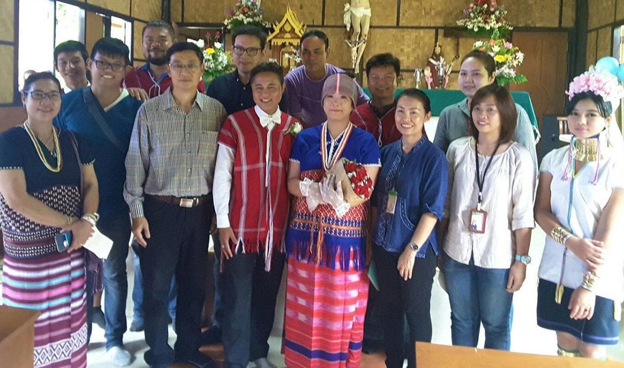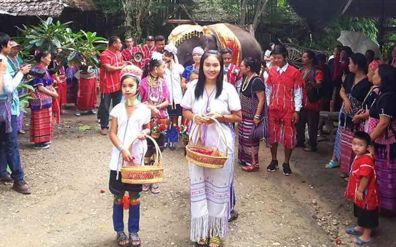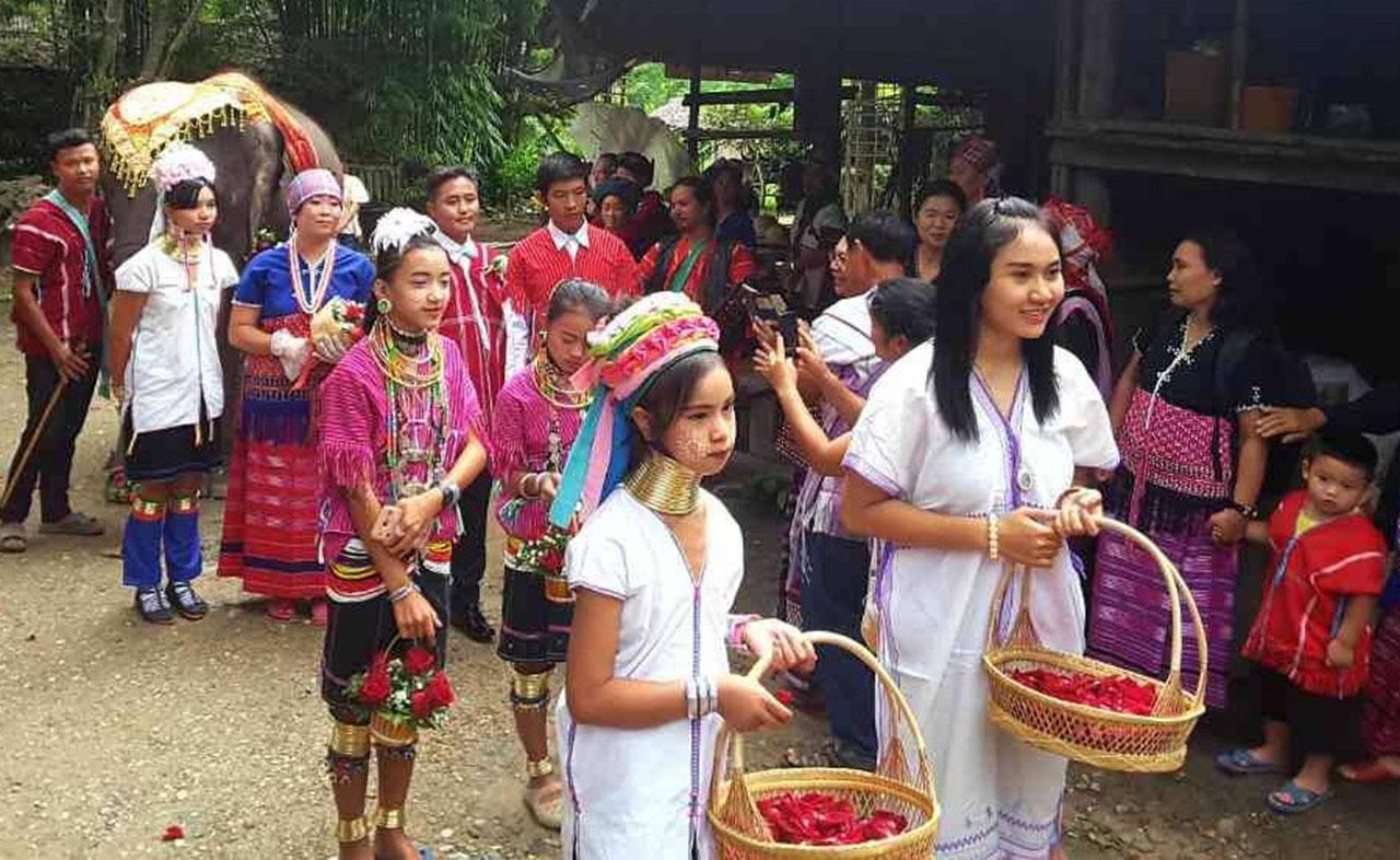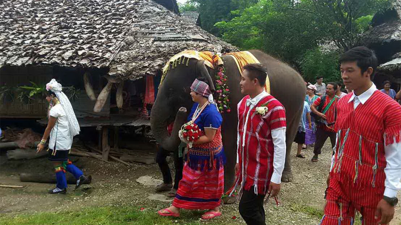 โดยพิธีการแต่งงานจัดแบบประเพณีกะเหรี่ยงแบบโบราณ ทั้งเจ้าบ่าว และเจ้าสาว ต้องแต่งชุดเต็มยศ ของเผ่ากะเหรี่ยง หรือ (ปกาเกอะญอ) โดยมีสมาชิกในหมู่บ้านกว่า 200 คน ร่วมกันแห่ขันหมากจากบ้านเจ้าบ่าวมายังโบสถ์คริสต์ (คาทอลิก) ภายในหมู่บ้านห่างออกไปประมาณ 300 เมตร การแต่งงานครั้งนี้ โดยใช้ช้างเป็นสัตว์นำโชคเพื่อนำแห่ขบวนแต่งงานอีกด้วย ทั้งนี้เนื่องจากชาติพันธุ์ ชนเผ่ากะเหรี่ยง หรือ ปกาเกอะญอ เป็นชนเผ่าที่ขึ้นชื่อว่าเป็นผู้เชี่ยวชาญในการเลี้ยงช้างมาแต่โบราณและเป็นสัตว์ที่อยู่คู่กับชนเผ่านี้มานาน จึงเกิดมีความผูกพันกับช้างมาช้านาน