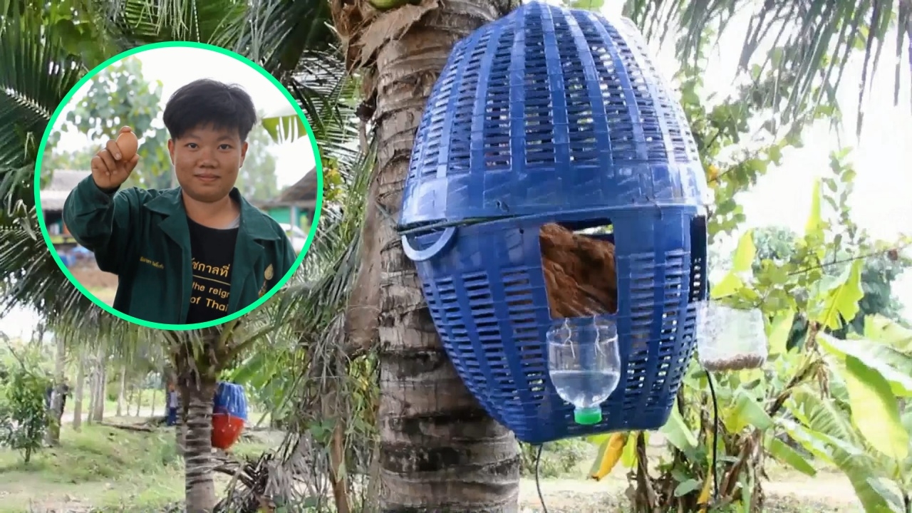 สุดแปลกแหวกแนว เกษตรกรสาวรุ่นใหม่วัย 22 ปี ที่พะเยา คิดต่าง ใช้ต้นมะพร้าว เลี้ยงไก่ไข่ เอาตะกร้าครอบทำเป็นกรงเลี้ยงแบบขังเดี่ยว ไก่ไม่เครียด สุขภาพดี ไข่ออกมาลูกใหญ่ ทั้งยังได้มูลไก่เป็นปุ๋ยต้นไม้ด้วย...
