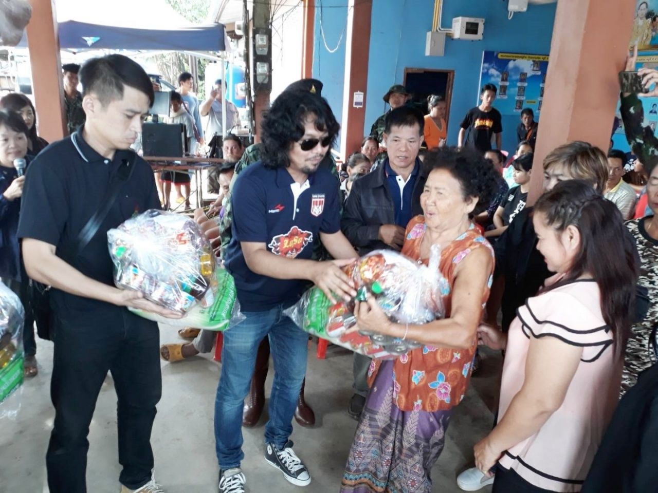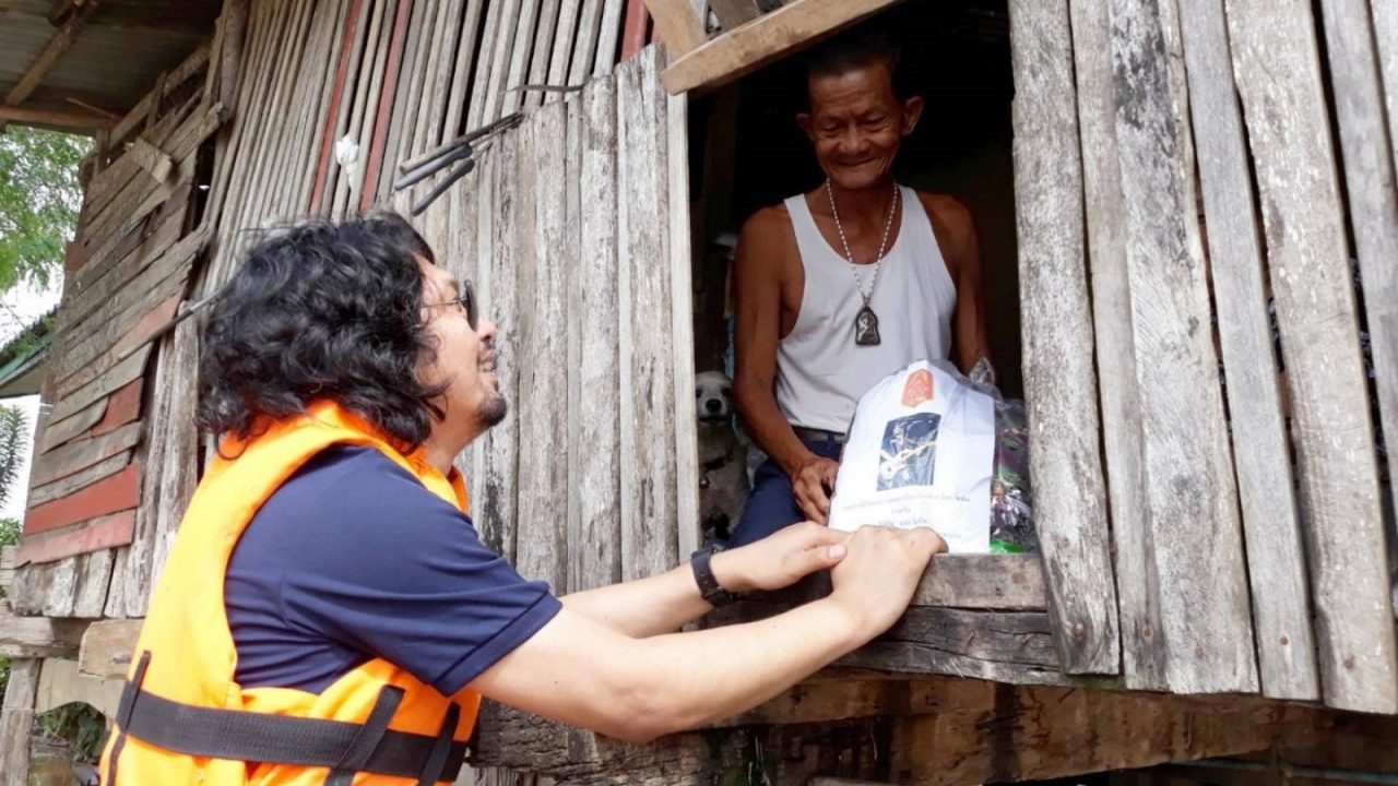 วันที่ 20 ก.ย. ที่ศาลาประชาคมบ้านมะขามค่อม ม.9 ต.ยางซ้าย อ.เมือง จ.สุโขทัย "เสก โลโซ" ศิลปินชื่อดังพร้อมด้วย พ.อ.บุญเชิด นครรัมย์ หน.ฝกร.กกล.รส.จ.สุโขทัย พ.อ.เอกพล คุโณปกรณ์ ผบ.พัน.สร.23 บชร.3 และคณะ ได้ลงเรือท้องแบนเข้าไปยังศาลาประชาคม มอบเครื่องอุปโภค-บริโภคของใช้ที่จำเป็นพร้อมน้ำดื่มให้กับผู้ประสบอุทกภัย โดยมีนายบรรเทา พร้อมเพรียง นายก อบต.ยางซ้ายและคณะผู้บริหารให้การต้อนรับ
