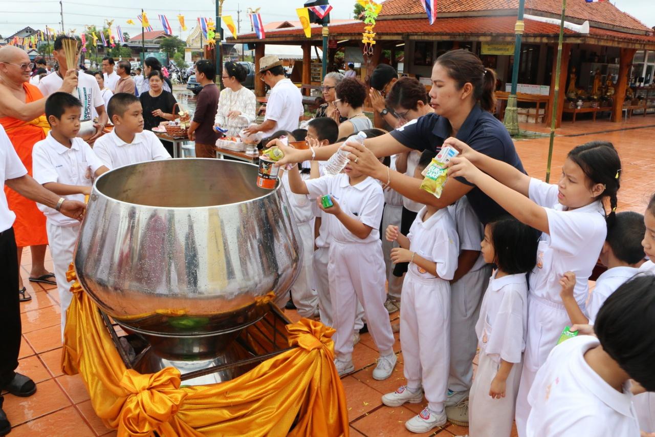 ส่วนภายในศาลามีการตักบาตรอาหารหวานคาว ท่ามกลางผู้ที่มาใส่บาตรล้นออกมานอกศาลา โดยทางวัดได้ประดิษฐานพระบรมฉายาลักษณ์พระบาทสมเด็จพระปรมินทรมหาภูมิพลอดุลยเดช พร้อมจัดประดับอย่างสวยงามสมเกียรติ เพื่อเป็นการแสดงความอาลัยและทำบุญถวายเป็นพระราชกุศลแด่พระองค์ ด้วยสำนึกในพระมหากรุณาธิคุณที่พระองค์ทรงมีต่อพสกนิกรชาวไทยตลอดมา นอกจากนั้นทางวัดยังใช้เด็กๆ เป็น มัคนายก นำกล่าวของศีล นำกล่าวถวายภัตตาหารและพุ่มผ้าป่าด้วย เพื่อให้เด็กๆ ได้รู้จักการเป็นพุทธศาสนิกชนที่ดี เป็นการสืบต่อพระพุทธศาสนาให้ยืนยาวต่อไป.