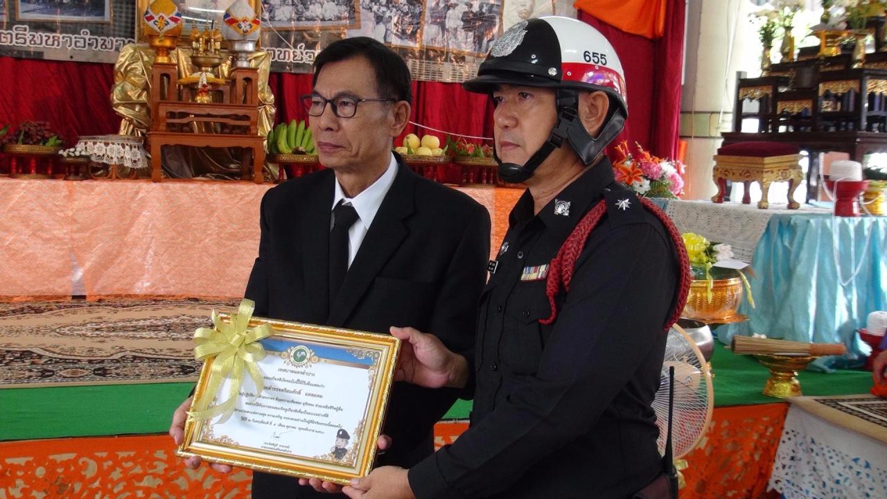 รองนายกเทศมนตรีนครลำปาง มอบเกียรติบัตรเชิดชูเกียรติ “ร.ต.ต.สมศักดิ์” รอง สว.จร. เจ้าตัวเผย ไม่ว่า ตร.นายใดอยู่ในสถานการณ์นี้ต้องทำเช่นเดียวกัน ขณะพ่อเด็ก 6 ขวบ ขอบคุณช่วยลูกรอดชีวิตอีกครั้ง หลังเคยตกเหวตอนอายุ 2 เดือนมาแล้ว