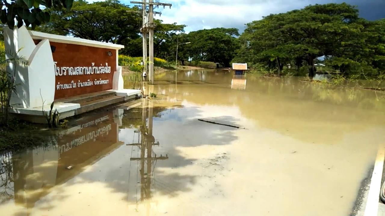 ที่ จังหวัดพะเยา หลังฝนตกติดต่อกันมาหลายวัน ส่งผลให้ระดับน้ำตามลำน้ำสายต่างๆ ในพื้นที่มีระดับเพิ่มสูงขึ้น รวมทั้งปริมาณน้ำในกว๊านพะเยา เพิ่มขึ้นสูงจากเดิมกักเก็บไว้ได้ 33 ล้านลูกบาศก์เมตร แต่ปัจจุบันมีระดับน้ำเพิ่มสูงขึ้นถึง 66 ล้านลูกบาศก์เมตร ซึ่งเกินปริมาณกักเก็บ ส่งผลให้น้ำในกว๊านพะเยาไหลเอ่อเข้าท่วมเรือกสวนไร่นา บ้านเรือน และโบราณสถาน ที่อยู่ริมแนวชายฝั่งกว๊านพะเยา