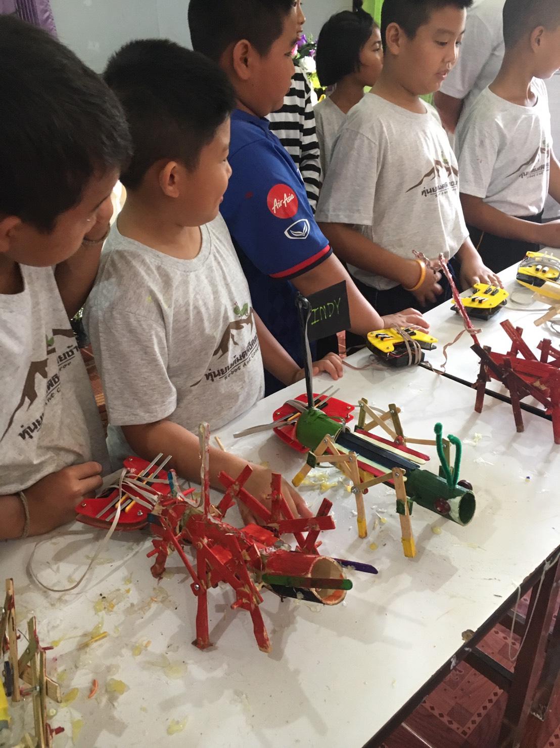 ขั้นตอนการแข่งขัน ได้นำวัสดุที่สามารถหาได้ในท้องถิ่นมาประยุกต์ใช้ เริ่มต้นเเนวคิด เพื่อขยับไม้ไผ่ ในการเเปรสภาพ เป็นชิ้น เชื่อมต่อกัน จากการออกเเบบ เเละนำชุดเฟืองทดมาติดตั้ง จนกลายเป็นหุ่นยนต์ที่สามารถควบคุมด้วยรีโมต ทำภารกิจเดินบนพื้นเรียบ เเละพื้นต่างระดับ ได้รับความสนใจจากเด็กๆ และสนุกสนานกันมากตลอดการอบรม