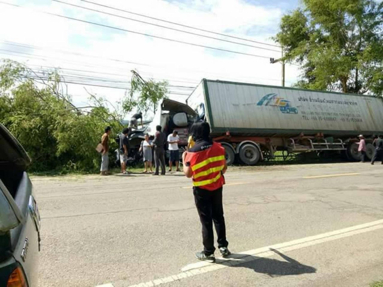 รถบรรทุกพ่วง ตู้คอนเทนเนอร์ 22 ล้อ พยายามแซงคันหน้า ก่อนเสียหลักพุ่งข้ามเลน ชนต้นไม้ข้างทาง บนถนนสายพะเยา-ป่าแดด หน้ารถพังยับ คนขับดับคาที่ ...