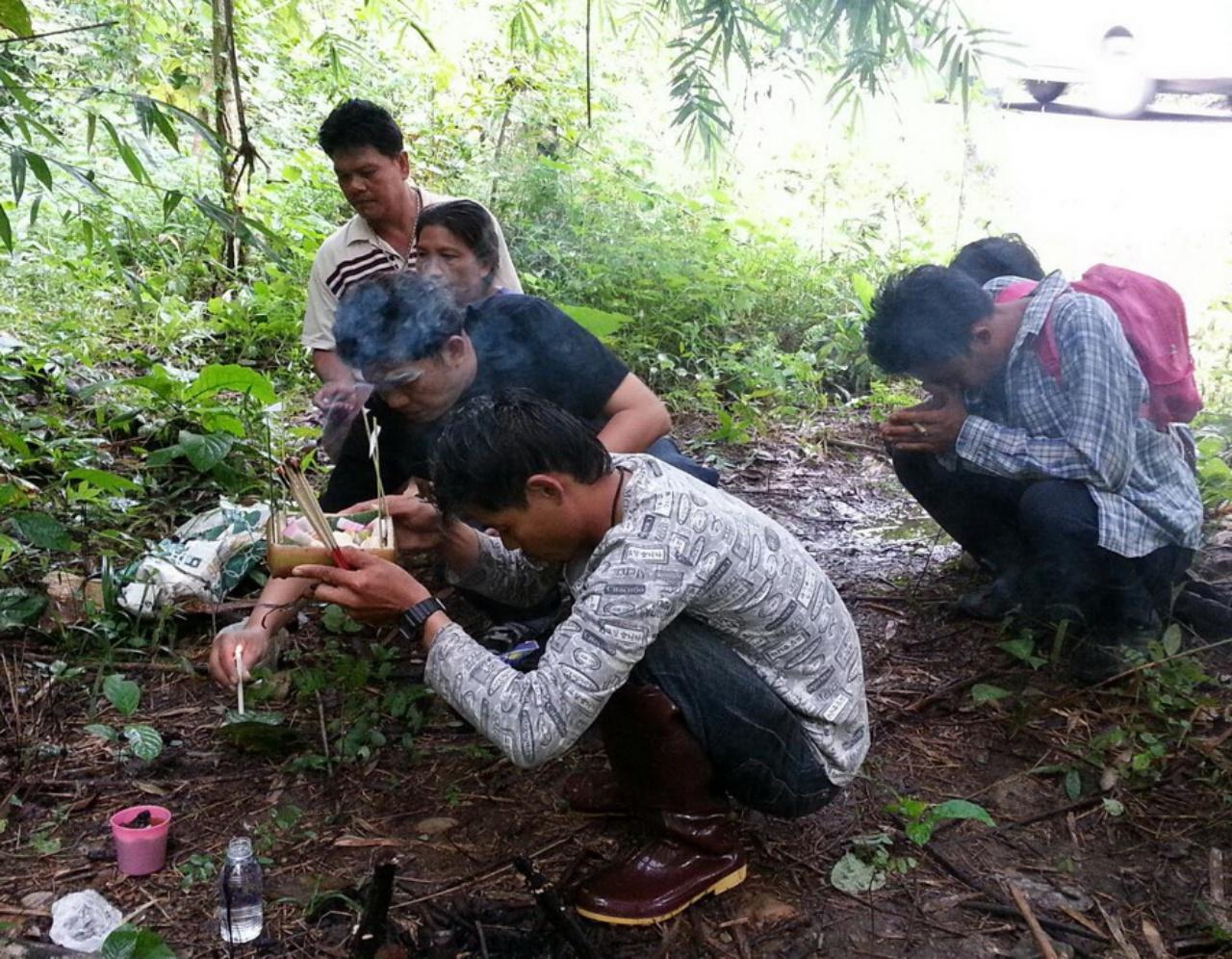 โดย นายน้อย ศูนย์กลาง อายุ 50 ปี ลูกชายของ พ่อเฒ่าเทิ้ม ได้นำญาติพี่น้อง รวม 6 คน ทำพิธีขอขมา เจ้าป่า เจ้าเขา เพื่อดลบันดาลให้เปิดทางในการค้นหาพ่อได้สำเร็จ บริเวณป่าเขตรอยต่อบ้านทุ่งแล้ง-บ้านแม่สะลาบ ตามคำแนะนำของ หมอเมือง หรือ หมอไสยศาสตร์พื้นบ้านว่า วันนี้ให้ญาติๆ ทำพิธีขอขมาเพื่อให้เจ้าป่าเจ้าเขา เปิดฟ้าเปิดป่า ตอนมีแสงสว่างของพระอาทิตย์ขึ้น ก็จะเจอพ่อเฒ่าผู้สูญหาย หลังจากบรรดาลูกๆ ได้ทำพิธีขอขมาเสร็จสิ้น ต่างก็กระจายกำลังระดมออกค้นหาอีกครั้ง ทั้งลำห้วยใหญ่ 2 ห้วย และ ลำห้วยสาขาอีกกว่า 20 ลำห้วย ซึ่งเป็นเส้นทางป่าในเขตป่าสงวนแห่งชาติแม่ยวมฝั่งขวา ที่ตาเทิ้มมักจะออกหาเห็ดของป่าเป็นประจำ แบบปูพรมทุกตารางนิ้ว