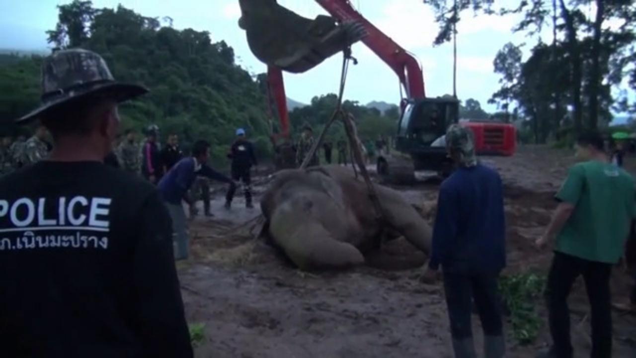ต่อมาทีมสัตวแพทย์สถาบันคชบาลแห่งชาติ จ.ลำปาง และคณะเดินทางมาเข้าช่วยเหลือช้างเชือกดังกล่าว โดยให้น้ำเกลือและฉีดยาบำรุง และได้นำรถแบ็กโฮ จำนวน 2 คัน มาขุดดินปรับพื้นที่ พร้อมใช้เชือกมัดตัวยกช้างให้ลุกยืนขึ้นให้ได้ เพื่อจะได้ดูอาการว่าช้างเชือกนี้มีอาการบาดเจ็บมากน้อยเพียง โดยทางเจ้าหน้าที่ใช้เวลานานกว่า 3 ชม. จึงจะสามารถนำช้างมายืนและผูกไว้กับต้นยางขนาดใหญ่ที่อยู่บริเวณโดยรอบ พร้อมทั้งทำคอกให้ช้างยืนทรงตัวเอาไว้