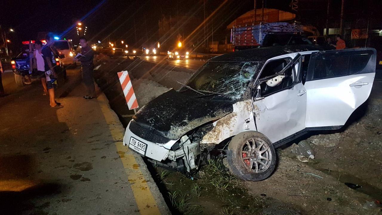 จากการสอบถามพยานที่เห็นเหตุการณ์ให้การว่า รถคันนี้ขับมาด้วยความเร็วจากสี่แยกข่วงสิงห์ มุ่งหน้าไปทางสะพานป่าตัน เพื่อไปทะลุออก อ.สันทราย พอมาถึงที่เกิดเหตุเป็นจุดที่กำลังก่อสร้างถนน และทางค่อนข้างมืด อาจทำให้คนขับรถมองไม่เห็นประกอบกับขับมาด้วยความเร็ว หักชนแผงกั้นข้างทางจนเกิดอุบัติเหตุพลิกคว่ำดังกล่าว ซึ่งเจ้าหน้าที่จะได้สอบถามผู้บาดเจ็บอีกครั้ง เพื่อหาสาเหตุที่แท้จริง ดำเนินการตามกฎหมายต่อไป.