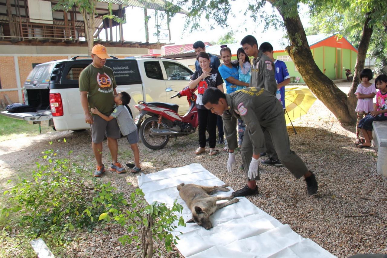 หลังรับแจ้งหน่วยกู้ภัยจึงใช้จอบช่วยกันขุดดิน เพื่อนำซากแม่สุนัข และลูกสุนัข 2 ตัวที่ติดอยู่ภายในโพรงออกมา โดยโพรงดังกล่าวมีแผ่นปูนทับอยู่ด้วย จึงยากต่อการนำสุนัขออกมา หลังจากช่วยกันขุดดินและช่วยกันยกแผ่นปูนขึ้นได้ พบว่าภายในโพรงมีแม่สุนัขที่เพิ่งคลองลูกได้เพียง 2 วัน นอนตายอยู่ มีน้ำลายฟูมปาก ข้างตัวแม่สุนัขมีลูกสุนัขที่ส่งเสียงร้องอยู่ จำนวน 2 ตัวเป็นเพศผู้ 1 ตัว เพศเมีย 1 ตัว สีดำขาว พยายามที่จะซุกตัวเองกับตัวแม่สุนัข หน่วยกู้ภัยจึงนำลูกสุนัขออกมาได้อย่างปลอดภัย