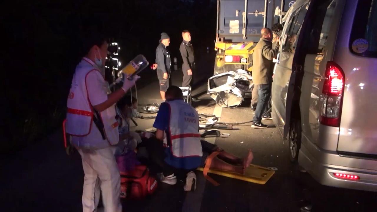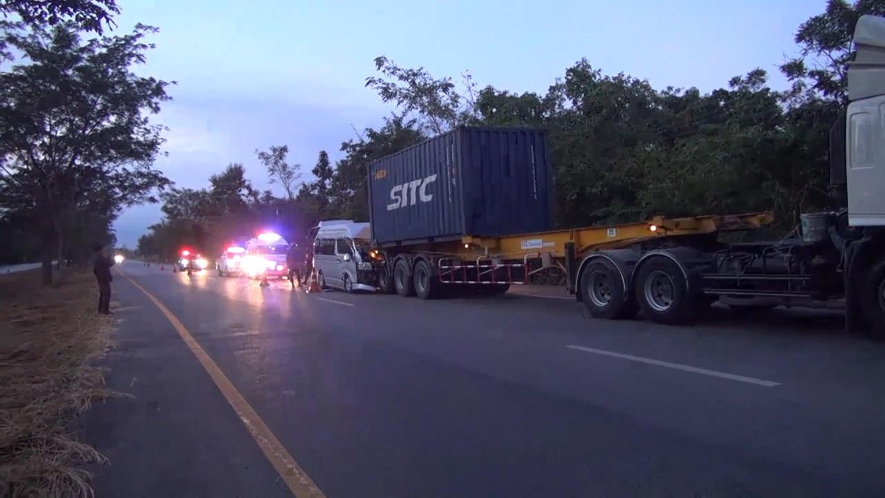ที่เกิดเหตุที่บนถนนสายดังกล่าว พบรถยนต์ตู้โตโยต้า สีขาว ทะเบียน ฮจ 4877 กรุงเทพมหานคร มีนายมาโนช เกิดสมนึก อายุ 51 ปี ชาว จ.สุพรรณบุรี เป็นคนขับ สภาพด้านหน้ารถตู้พังยับ ชนกับท้ายรถบรรทุกตู้คอนเทนเนอร์ 18 ล้อ หมายเลขทะเบียน (ด้านท้าย) 70 6344 เชียงใหม่ มีผู้ได้รับบาดเจ็บทั้งหมด 12 รายรวมคนขับ บาดเจ็บสาหัส 1 ราย บาดเจ็บเล็กน้อยและทั่วไป 11 ราย แยกเป็นผู้ใหญ่ชาย 2 หญิง 7 และเด็กชาย 1 และเด็กหญิง 2 ราย หน่วยกู้ภัยต้องใช้เครื่องตัดถ่างเข้าช่วยเหลือนานเกือบ 20 นาทีจึงสามารถนำผู้ได้รับบาดเจ็บออกมาได้ พร้อมนำผู้ได้รับบาดเจ็บทั้งหมดส่งโรงพยาบาลสบปราบ
