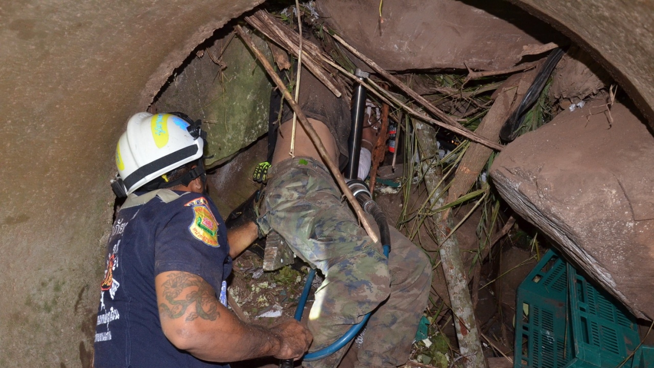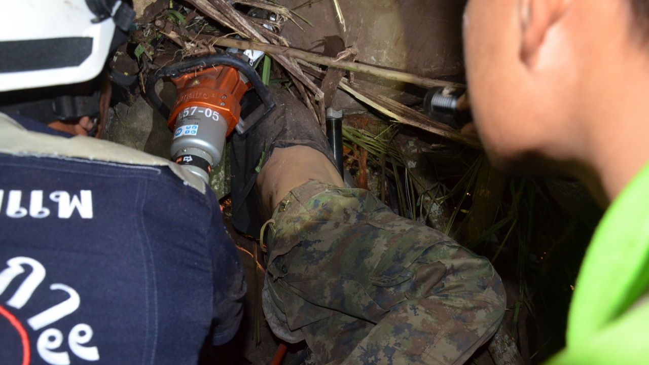 ส่วนรถคันเกิดเหตุอยู่ในลักษณะพลิกคว่ำลงข้างทาง ลึกประมาณ 10 เมตร มีผู้ติดคาซากรถ และมีก้อนหินและกิ่งไม้ทับร่างแน่น จนท.กู้ภัยเต็กก่าจีแชเกาะ ชุดที่ 1 ซึ่งอยู่ด้านบนต้องใช้เครื่องตัดถ่างงัดก้อนหิน ส่วนอีกชุดนำกำลังต้องลอดท่อระบายใต้ท้องถนน ยาวประมาณ 25 เมตร ไปถึงจุดด้านล่างของร่างผู้ติดอยู่ ซึ่งจนท.กู้ภัย ต้องใช้ความระมัดระวัง ในการใช้เครื่องมือ เนื่องจากก้อนหินขนาดใหญ่ มีแนวโน้มที่จะเคลื่อนมาทับร่างผู้ที่ติดคาซากได้ทุกขณะ