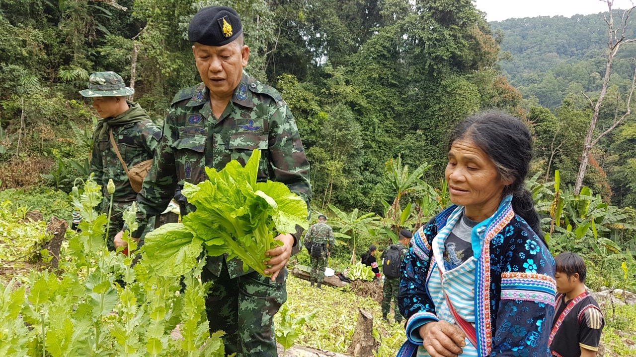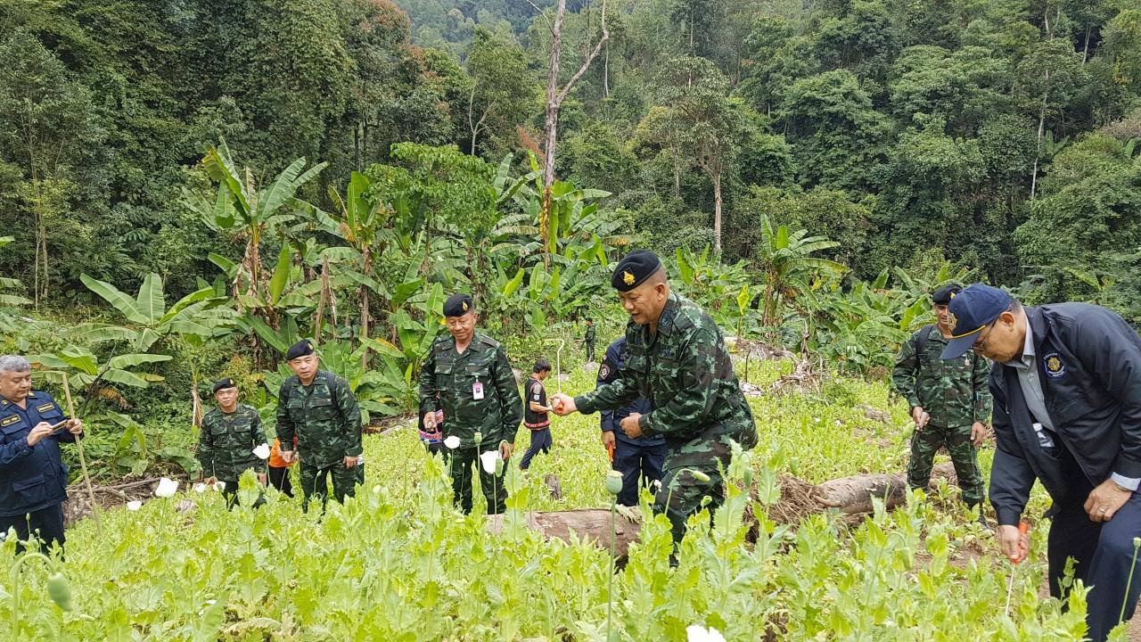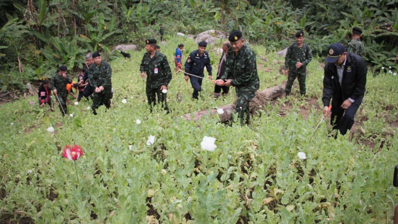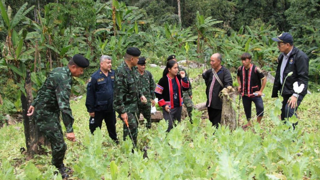 ซึ่งการเดินทางเข้าไปในแปลงฝิ่นนั้น ต้องเดินเท้าจากลานจอดเฮลิคอปเตอร์เข้าไปในป่าอีกประมาณ 30 นาที ก็พบแปลงฝิ่นขนาดใหญ่ ฝิ่นนั้นเริ่มออกดอกเป็นสีต่างๆ ซึ่งที่นี่นั้นส่วนมากจะเป็นสีขาว และในครั้งนี้ชาวบ้านนั้นปลูกฝิ่นปะปนไปกับผักกาดจ้อนหรือว่าผักกาดกวางตุ้ง เพื่อไม่ให้เป็นที่สงสัยของเจ้าหน้าที่เวลาลาดตระเวนทางอากาศ เจ้าหน้าที่จึงร่วมกับชาวบ้านช่วยกันทำลายแปลงฝิ่นดังกล่าว
