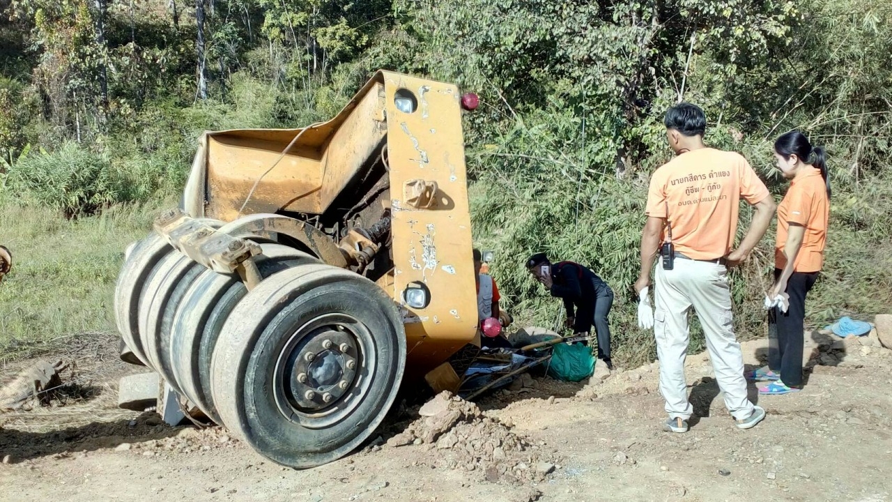 เกิดอุบัติเหตุรถบดถนนเสียหลักตกไหล่ถนนลุก 4 เมตร พลิกคว่ำคนขับกระเด็นออกมาก่อนโดนรถบดกลิ้งทับร่างตายคาที่ บนถนนสายสายตาก-แม่สอด...