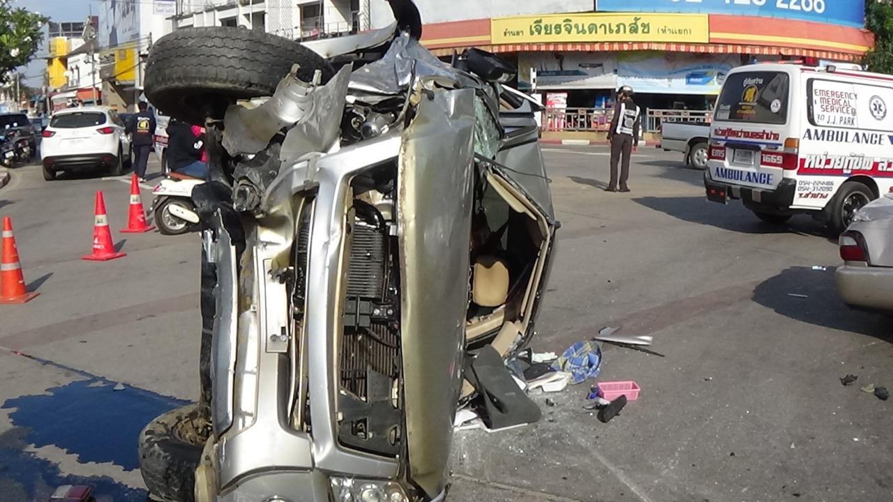 เมื่อเวลา 15.30 น.วันที่ 15 ม.ค.61 พ.ต.ท.นวพล พงษ์ไพโรจน์ สว. (สอบสวน) สภ.เมืองลำปาง อ.เมือง จ.ลำปาง รับแจ้งเหตุรถยนต์ชนกันหลายคันมีผู้ได้รับบาดเจ็บหลายรายที่บริเวณวงเวียนห้าแยก หอนาฬิกา เขตเทศบาลนครลำปาง ต.สบตุ๋ย อ.เมืองลำปาง จึงรุดไปที่เกิดเหตุพร้อมด้วย หน่วยกู้ภัย สมาคมกู้ภัยสว่างลำปาง ที่เกิดเหตุพบรถกระบะอีซูซุ สีบรอนซ์ หมายเลขทะเบียน กท.1739 ลำปาง พลิกตะแคงอยู่ที่กลางถนนใกล้กับวงเวียนห้าแยกหอนาฬิกา ภายในรถคันดังกล่าวมีผู้ได้รับบาดเจ็บ 2 ราย คือ นายไกรฤกษ์ พงษ์ประเสริฐ อายุ 63 ปี คนขับ และนางวิไล พงษ์ประเสริฐ อายุ 63 ปี ภรรยาซึ่งนั่งมาด้วย ทั้งคู่เป็นชาวบ้านหมู่ที่ 10 ต.ชมพู อ.เมือง จ.ลำปาง