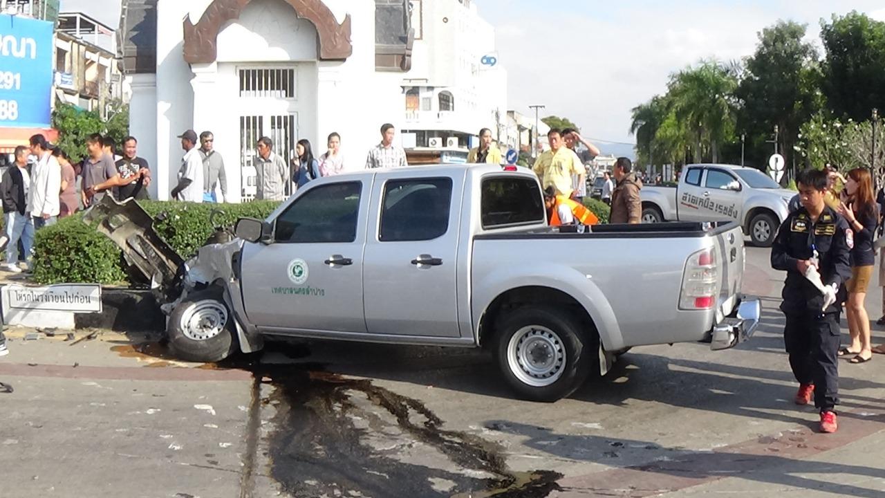สอบสวนเบื้องต้นทราบว่า นายไกรฤกษ์ คนขับรถยนต์กระบะ ยี่ห้ออีซูซุ สีบรอนซ์เงิน หมายเลขทะเบียน กท 1739 ลำปาง ขับมาจากทางถนนฉัตรไชย มุ่งหน้าไปยังวงเวียนห้าแยกหอนาฬิกาด้วย เมื่อผ่านโรงรับจำนำเล็กน้อย เกิดบังคับรถไม่อยู่ จนไปเฉี่ยวชนกับรถกระบะ รถเก๋งแจ๊ส และรถจยย.ได้รับความเสียหายก่อนที่จะพุ่งไปด้วยความเร็วชนกับรถกระบะสี่ประตูของเทศบาล ที่ขับมาอยู่ในวงเวียนตามเส้นทางปกติ แล้วกระเด็นพลิกไปใส่รถเก๋งสีบรอนซ์จนพลิกตะแคงดังกล่าว รวมมีรถได้รับความเสียหายทั้งหมด 6 คัน (รวมคันที่ก่อเหตุ)