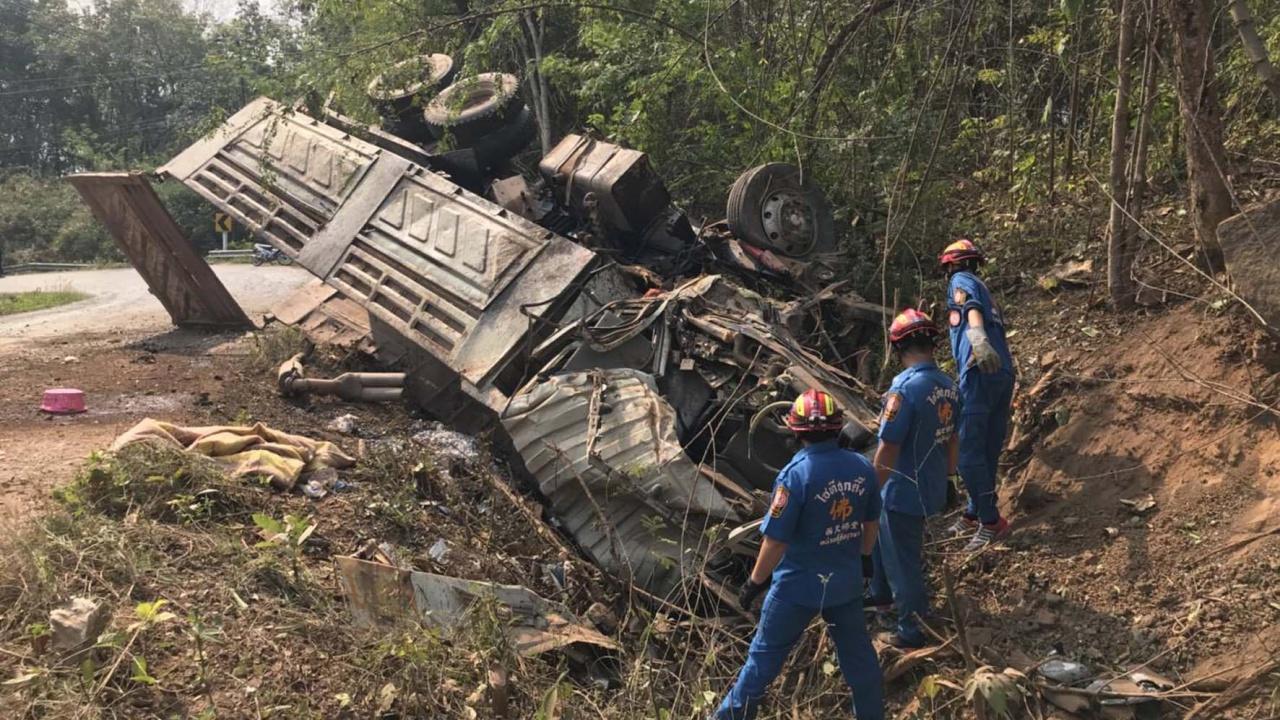 สิบล้อไหลลงเขา เบรกไม่อยู่ พุ่งชนกับก้อนหินขนาดใหญ่ ก่อนพลิกคว่ำลงข้างทาง บริเวณโค้งร้อยศพ ที่พิษณุโลก ทับคนขับดับคาที่ ...