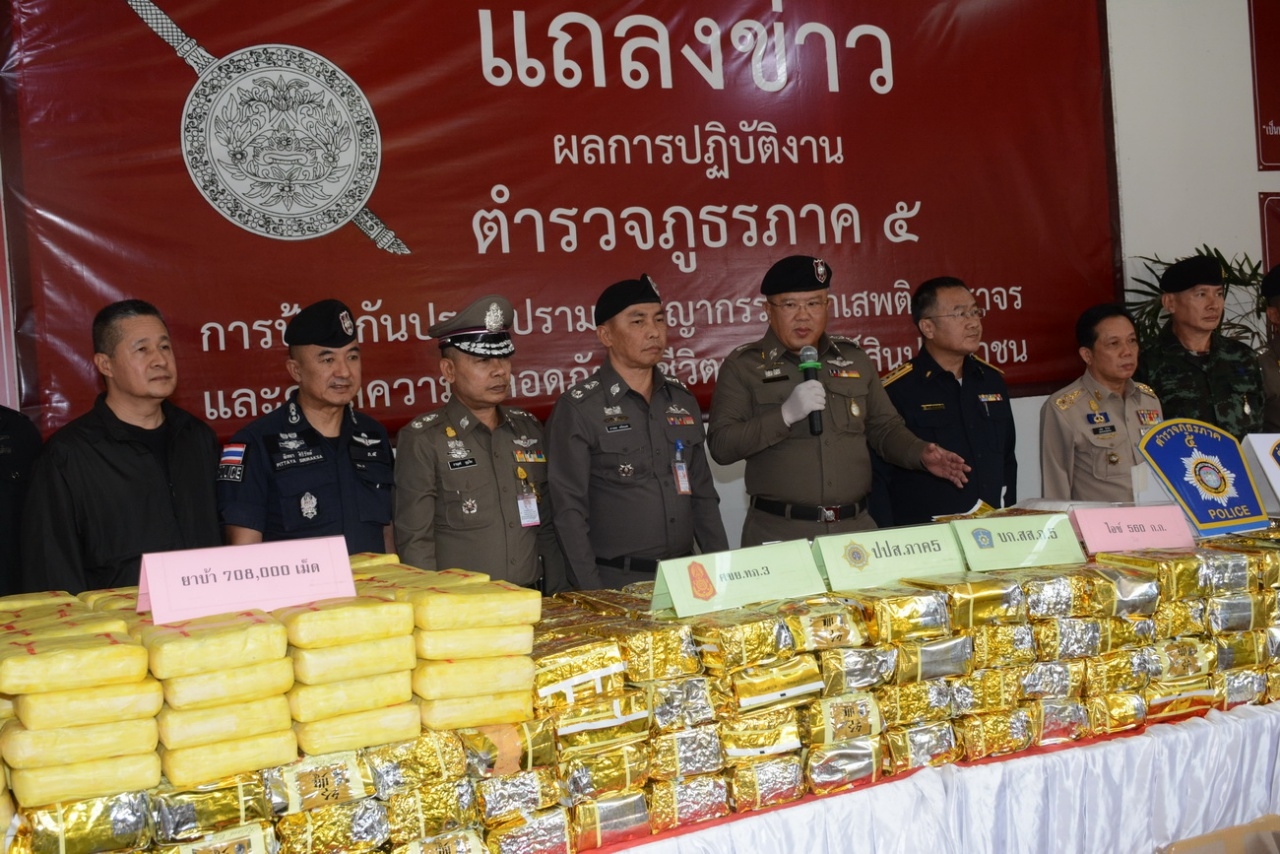 เวลา 16.30 น. วันที่ 11 ก.พ. ที่กองบังคับการสืบสวนสอบสวน ตำรวจภูธรภาค 5 อ.เมืองเชียงใหม่ พล.ต.ต.พูลทรัพย์ ประเสริฐศักดิ์ ผบช.ภ.5 พล.ต.ต.ภาณุเดช บุญเรือง รอง ผบช.ภ. 5 พล.ต.ต.จารึก ลิ้มสุวรรณ ผบก.สส.ภ 5 พล.ต.ต.ดาวลอย เหมือนเดช รอง ผบช.ภ. 9 พ.ต.ท.จักรพันธ์ คงแก้ว หัวหน้าชุดขยายผลยาเสพติด ตำรวจภูธรภาค 9 ฝ่ายทหาร พร้อมฝ่ายปกครองและสำนักงาน ป.ป.ส. ภาค 5 ได้ร่วมกับแถลงข่าวการจับกุมแก๊งค้ายาเสพติดรายใหญ่ พร้อมของกลางไอซ์หนักประมาณ 500 กิโลกรัม และยาบ้า จำนวน 700,000 เม็ด