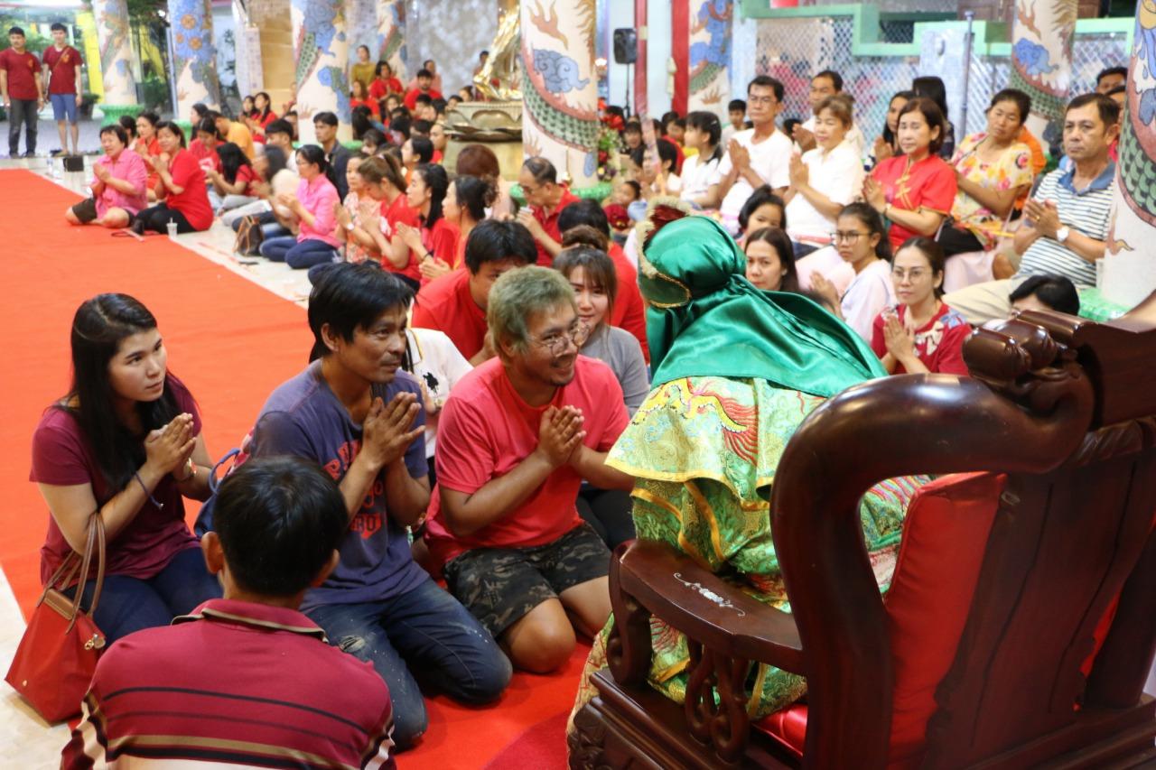 โดยเทพเจ้ากวนอูได้ประทับทรงสอนวิธีการไหว้การอธิษฐาน การขอโชคลาภ และหลังจากไหว้ปักแล้วให้ใช้มือขวาจับที่หัวมังกรซึ่งอยู่ที่ชุดสวมใส่ของไฉ่ซิงเอี้ย มือซ้ายจับที่จมูกเสือซึ่งเทพเจ้าไฉ่ซิงเอี้ยประทับนั่งเป็นสัตว์พาหนะแล้วอธิษฐานขอโชคลาภเงินทองที่เทพเจ้าไฉ่ซิงเอี้ยประทานให้ถือเป็นเคล็ดลับ
