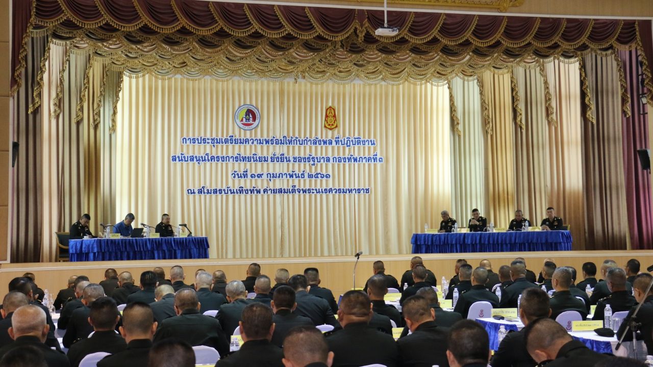 กองทัพภาคที่ 3 จึงได้จัดการประชุมเตรียมความพร้อมให้กำลังพลที่ปฏิบัติงาน โครงการไทยนิยม ยั่งยืน ของรัฐบาล เพื่อเป็นการสนับสนุนภารกิจของรัฐบาล และเพื่อให้มีความเข้าใจอย่างถ่องแท้ ถึงหลักพื้นฐานการทรงงาน ของในหลวง รัชกาลที่ 9 นั่นคือ "การเข้าใจ เข้าถึง และพัฒนา" ตลอดจนเพื่อนำไปปฏิบัติงานในการลงพื้นที่ให้ประชาชนได้มีส่วนร่วม ในการช่วยคิด ช่วยพัฒนา และช่วยแก้ไขปัญหา ความเป็นอยู่ต่างๆ ที่เดือดร้อนในทุกมิติ ตรงกับความต้องการที่แท้จริง และมุ่งไปสู่การอยู่ดีกินดี ยกระดับคุณภาพชีวิตของประชาชนให้ดีขึ้น สำหรับการประชุมในครั้งนี้ ได้มีการบรรยายพิเศษ ในเรื่อง "แนวทางการเข้าพบประชาชน เพื่อรับทราบความต้องการของประชาชน" โดยมี นายณรงค์ อภิชัย ประธานฝ่ายพัฒนา มูลนิธิแม่ฟ้าหลวง โครงการพัฒนาดอยตุง (พื้นที่ทรงงาน) อันเนื่องมาจากพระราชดำริ มาเป็นวิทยากรบรรยายพิเศษ เพื่อถ่ายทอดความรู้และประสบการณ์ให้กับผู้เข้าร่วมประชุม.