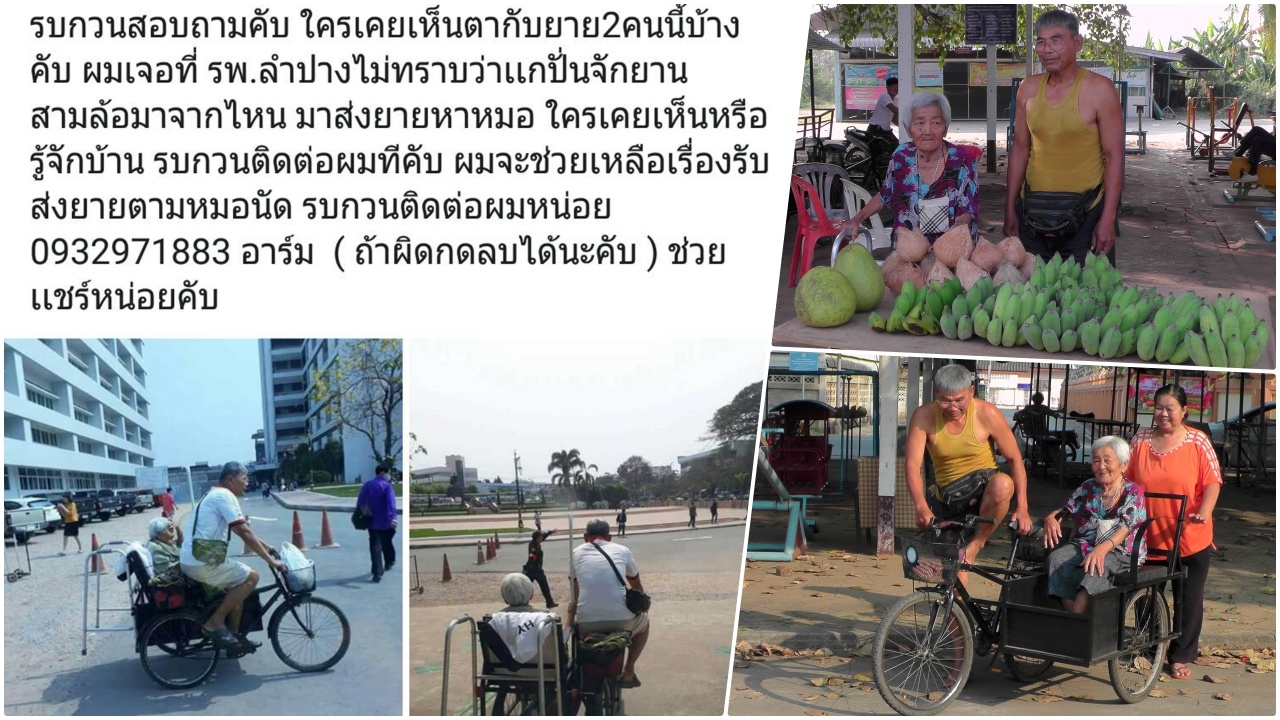 จากกรณีที่โลกโซเชียลที่จังหวัดลำปาง มีการโพสต์ภาพคุณตาคนหนึ่งปั่นจักรยานสามล้อพาคุณยายมาหาหมอที่โรงพยาบาล จนกลายเป็นภาพสะเทือนใจหลายคนอยากให้ความช่วยเหลือ โดยภาพดังกล่าวหลายคนได้มีการแชร์ส่งต่อไปเป็นจำนวนมาก