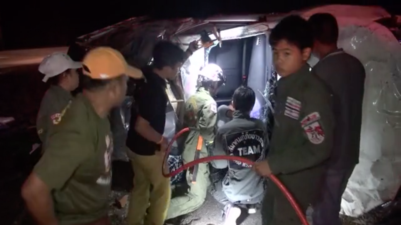 กำแพงเพชร รถกระบะ บรรทุกอุปกรณ์เลี้ยงสัตว์ เสียหลักพลิกคว่ำ สาเหตุฝนตกถนนลื่น เคราะห์ยังดีถังแก๊สออกซิเจน 15 ถัง ไม่ระเบิด จนท.ใช้เครื่องตัดถ่างช่วยชีวิตคนขับออกมาได้