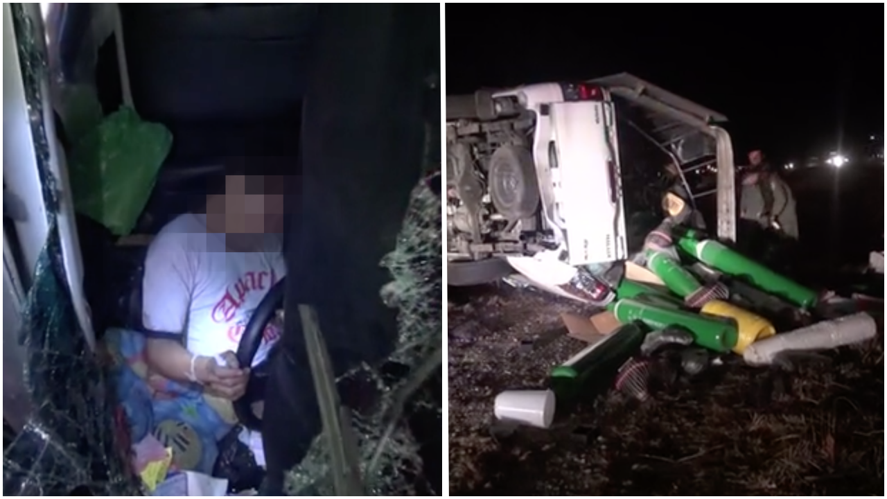 เบื้องต้น นายวันชัย ชัยศักดาเดช อายุ 58 ปี อยู่บ้านเลขที่ 10/1 หมู่ 9 ตำบลริมปิง อำเภอเมืองลำพูน จังหวัดลำพูน เป็นคนขับ เปิดเผยว่า ตนเองบรรทุกอุปกรณ์เลี้ยงสัตว์ เช่น ที่ใส่อาหารไก่, อุปกรณ์เลี้ยงไก่, และยังมีถังแก๊สออกซิเจนอีก จำนวน 15 ถัง บรรทุกมาเพื่อนำไปส่งให้ลูกค้าในภาคกลาง แต่เมื่อมาถึงที่เกิดเหตุ มีฝนตกทำให้ถนนลื่นและรถเสียหลักตกร่องกลางถนน และพลิกคว่ำดังกล่าว