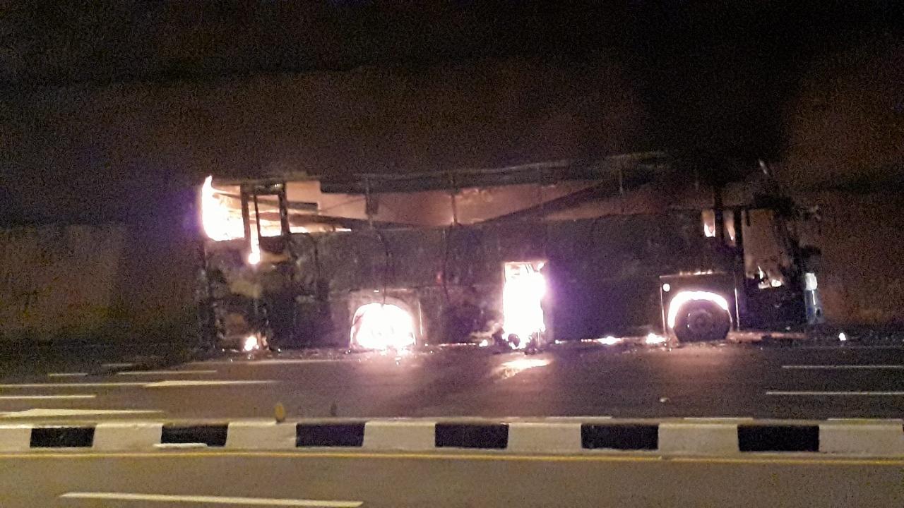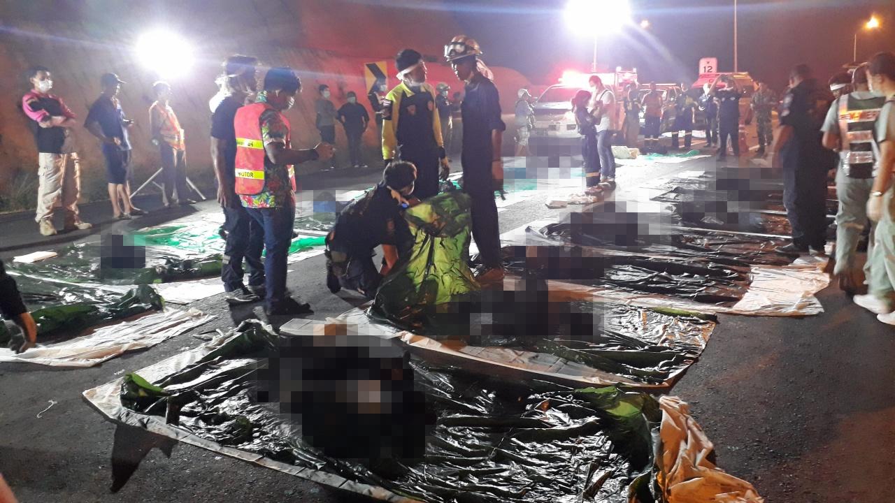 เจ้าหน้าที่ตำรวจจึงช่วยกันพร้อมหน่วยกู้ชีพ กู้ภัย ในพื้นที่ เดินทางไปที่เกิดเหตุ พบว่า รถทัวร์ได้ไหม้ทั้งคันแล้ว จากการสอบสวนเบื้องต้นทราบว่า มีผู้บาดเจ็บ27 คน เสียชีวิต 20 คน ซึ่งกู้ชีพ-กู้ภัย ได้พยายามระดมกำลังเข้าช่วยเหลือแล้ว โดยทราบว่ามีแรงงานชาวเมียนมา เดินทางนั่งมาในรถโดยสารประมาณ 50 คน (เป็นแรงงานชาวเมียนมาร์ 48 คน คนขับรถและภรรยา 2 คน) รวม 50 คน