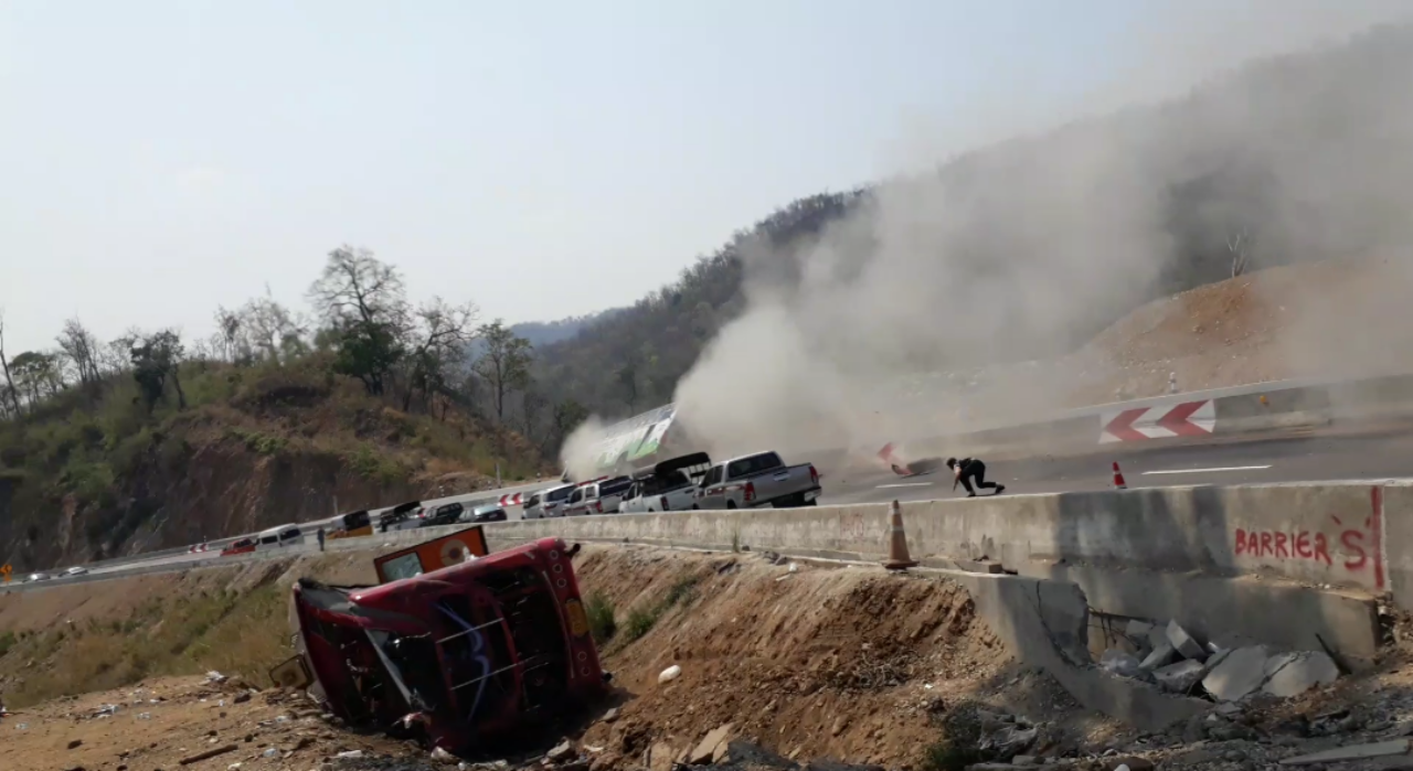 ต่อมาในเวลา 10.20 น. วันที่ 10 เม.ย. ได้เกิดอุบัติเหตุซ้ำในจุดเดิม ขณะเจ้าหน้าที่จากหลายหน่วยงานรวมทั้งผู้สื่อข่าวเดินทางมายังจุดเกิดเหตุ บริเวณ หลัก กม.ที่ 68+200 (กม.ที่ 68-69) ต้องหนีตายกันสุดชีวิต เมื่อรถบัสโดยสารไม่ประจำทาง หมายเลขทะเบียน 30-0269 ปทุมธานี ของ หจก.ยุพาการท่องเที่ยววิ่งรับส่งแรงงานชาวเมียนมา ที่ไปส่งผู้โดยสารที่ชายแดน อ.แม่สอด จ.ตาก ได้ตีรถเปล่า เพื่อกลับกรุงเทพฯ มีนายลำพูล แก้วเกลี้ยง อายุ 51 ปี เป็นคนขับมาเพียงคนเดียว