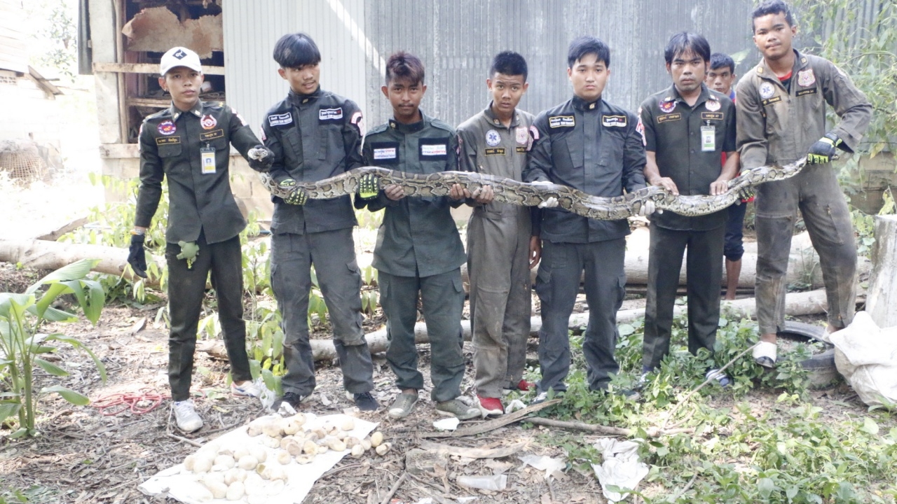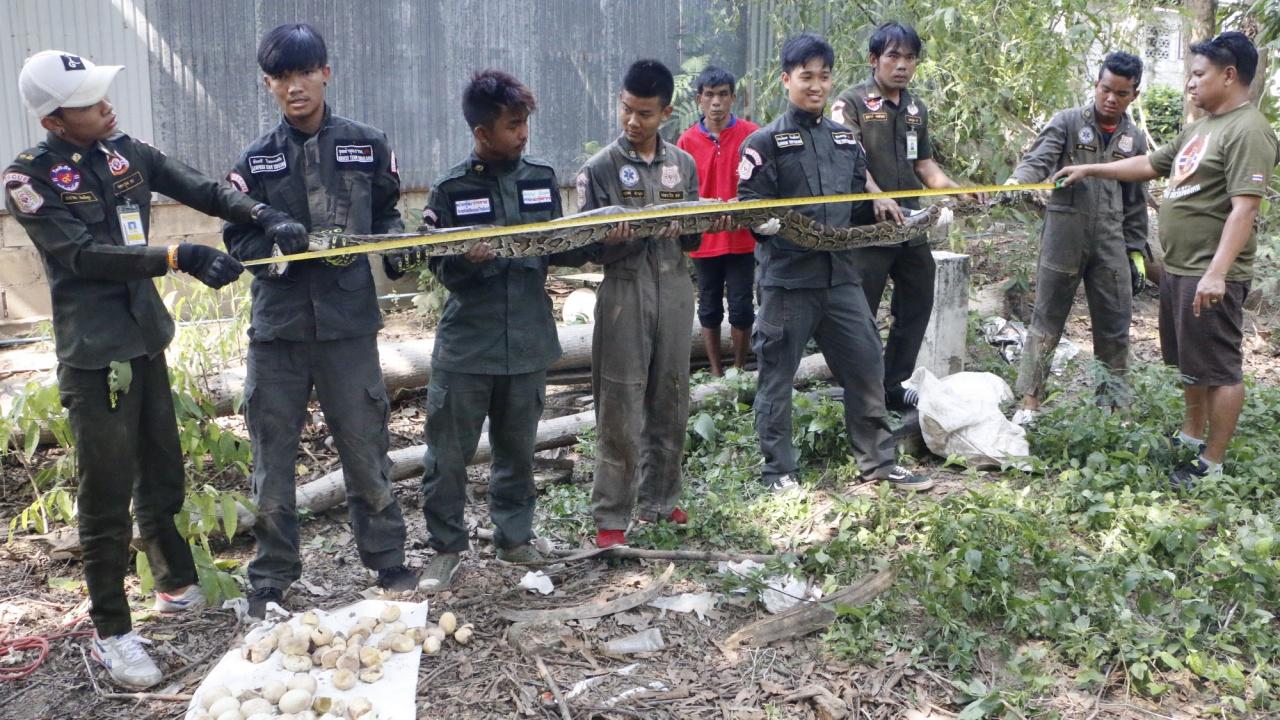 งูหลามยักษ์ยาวกว่า 3 ม. ซุกโกดังร้างฟักไข่ 60 ฟอง ฟักออกเป็นตัวไปแล้ว 35 ฟอง เหลือคารัง 25 ฟอง หน่วยกู้ภัยมาถึงเลื้อยหนีลงรูไปอยู่ห้องใต้ดิน กว่าจะจับได้ใช้เวลานาน จากนั้นใส่กระสอบปล่อยป่าพร้อมไข่