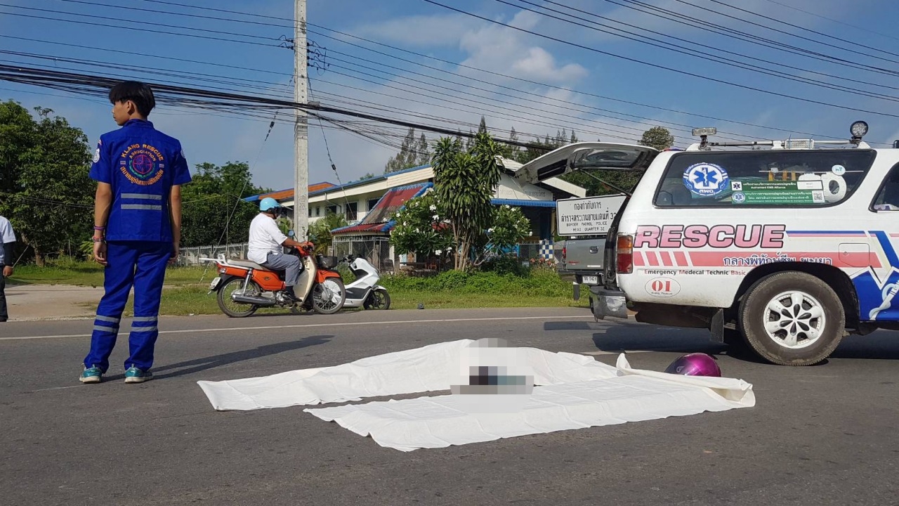 คุณป้าพะเยา ขี่ จยย.วิ่งซ้ายแล้วเปลี่ยนเลนกะทันหัน เฉี่ยวกับกระบะที่วิ่งมาเร็วในช่องด้านขวาจน จยย.กระเด็น หมวกกันน็อกหลุด ร่างปลิวหัวฟาดถนนดับคาที่...