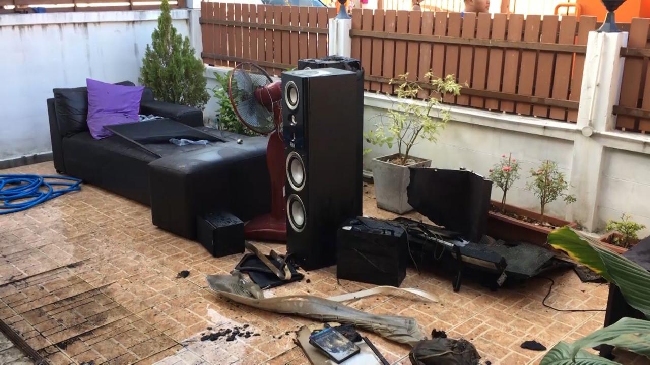 เมื่อไปถึง พบบริเวณห้องโถง ที่ชั้นวางทีวีและชุดเครื่องเสียงโฮมเทียร์เตอร์ ได้เกิดไฟลุกไหม้มีกลุ่มควันคละคลุ้งเต็มไปหมด เจ้าหน้าที่จึงได้ฉีดน้ำเพื่อดับไฟ และช่วยกันขนโซฟาและชั้นวาง ออกจากตัวบ้านเพื่อไม่ให้เกิดการลุกลาม ใช้เวลาประมาณ 10 นาที จึงสามารถควบคุมเพลิงเอาไว้ได้ จากเหตุการณ์ดังกล่าวทำให้ทีวีและชุดเครื่องเสียง พร้อมเฟอร์นิเจอร์ชั้นวางและผนังของตัวบ้านได้ ถูกไฟไหม้ได้รับความเสียหาย มูลค่าไม่ต่ำกว่า 50,000 บาท