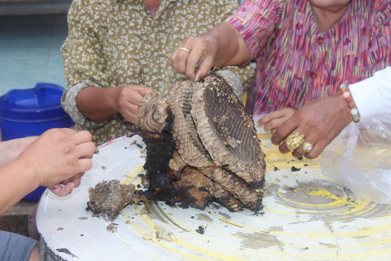 พบ นางย้อย มาตีบ อายุ72 ปี และนางบุญส่ง มาตีบ อายุ 61 ปี ซึ่งจ้างนายสัมพันธ์ อ้นนารี อาย 45 ปี พ่อค้าไอศกรีมกะทิ ในตลาดสดเทศบาลดงขุย มาเผารังต่อ บริเวณใต้ต้นมะม่วง เพื่อนำตัวอ่อนไปประกอบอาหารจานเด็ดกิน เพื่อเป็นยาชูกำลัง ขายจานละหลายร้อยบาท