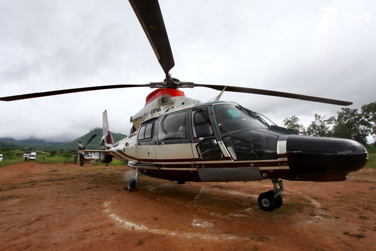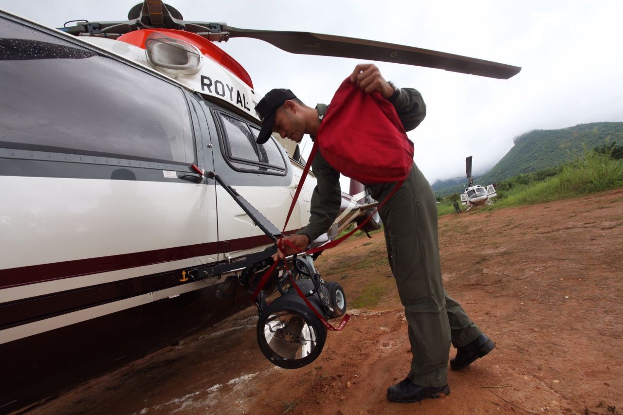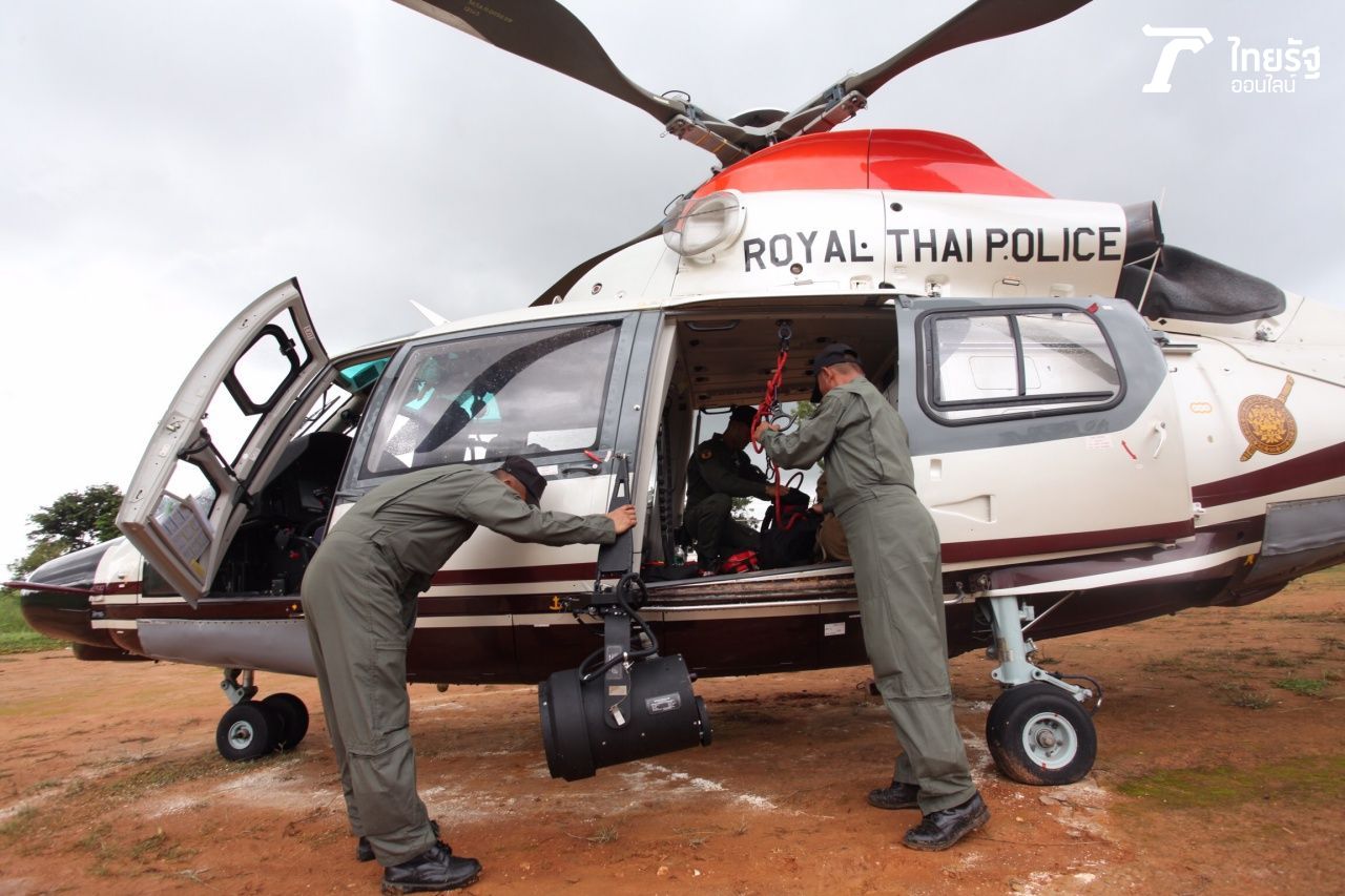 นักบินและเจ้าหน้าที่กู้ภัยสังกัดกองบินตำรวจ สำนักงานตำรวจแห่งชาติ กำลังตรวจความเรียบร้อยของเครื่องบินเฮลิคอปเตอร์ และอุปกรณ์การกู้ภัย เพื่อเตรียมปฏิบัติหน้าที่ช่วยเหลือนักฟุตบอลเยาวชนและโค้ช รวม 13 ชีวิต ที่ติดค้างในถ้ำหลวง-ขุนน้ำนางนอน อ.แม่สาย จ.เชียงราย แนวทางการปฏิบัติได้บินลาดตระเวนตามพื้นที่โดยรอบ ทั้งในเวลากลางวันและกลางคืน สามารถบินถึงจุดหมายพร้อมช่วยเหลือใช้เวลาไม่เกิน 10 นาที เมื่อได้รับคำสั่งและทราบพิกัดอย่างแน่นอน โดยประเภทของเครื่องบินเฮลิคอปเตอร์ที่ใช้ในภารกิจนี้ ประกอบด้วย 1.เฮลิคอปเตอร์กู้ภัยค้นและช่วยเหลือ 2.เฮลิคอปเตอร์พยาบาล 3.เฮลิคอปเตอร์ลำเลียง