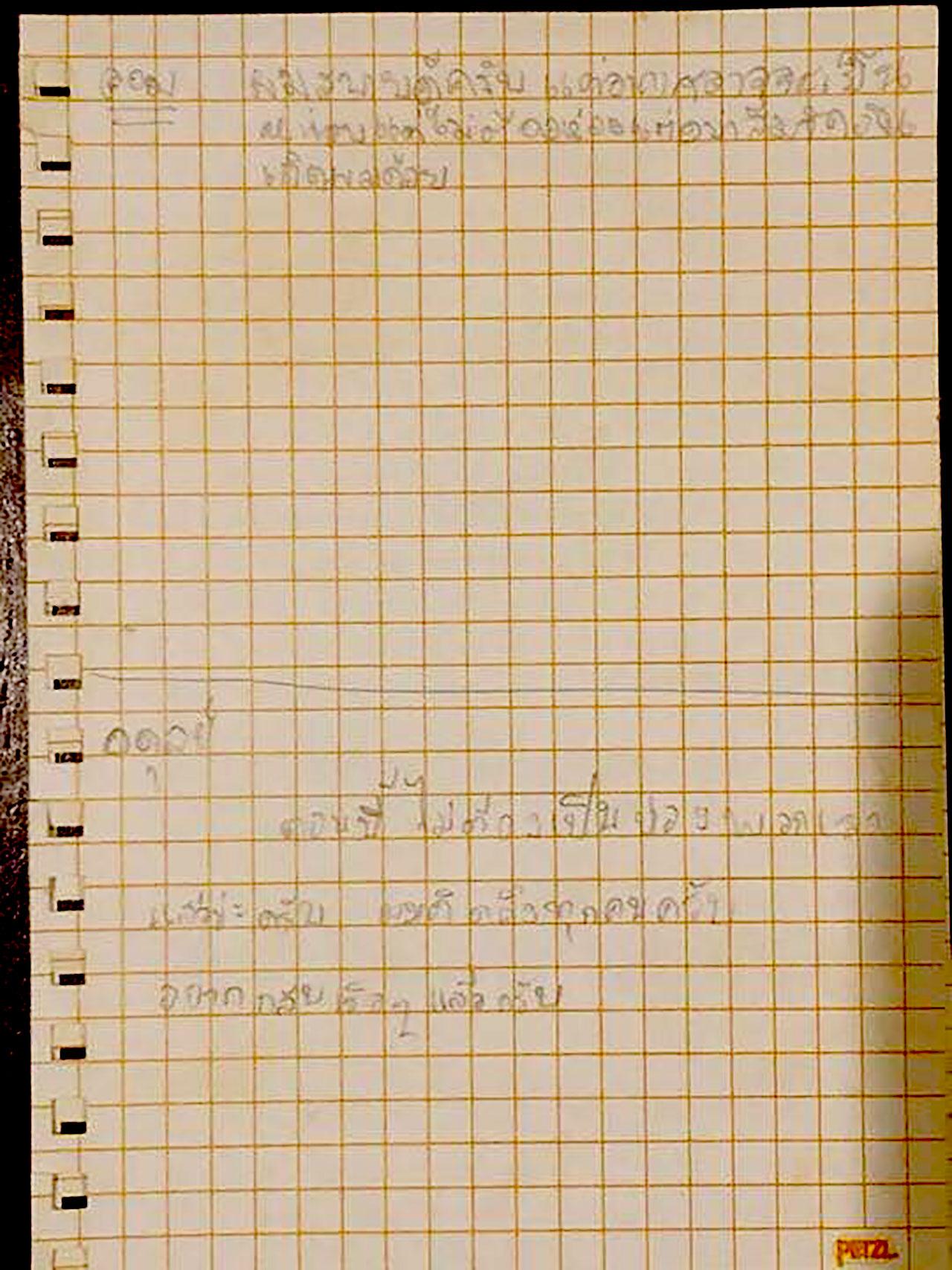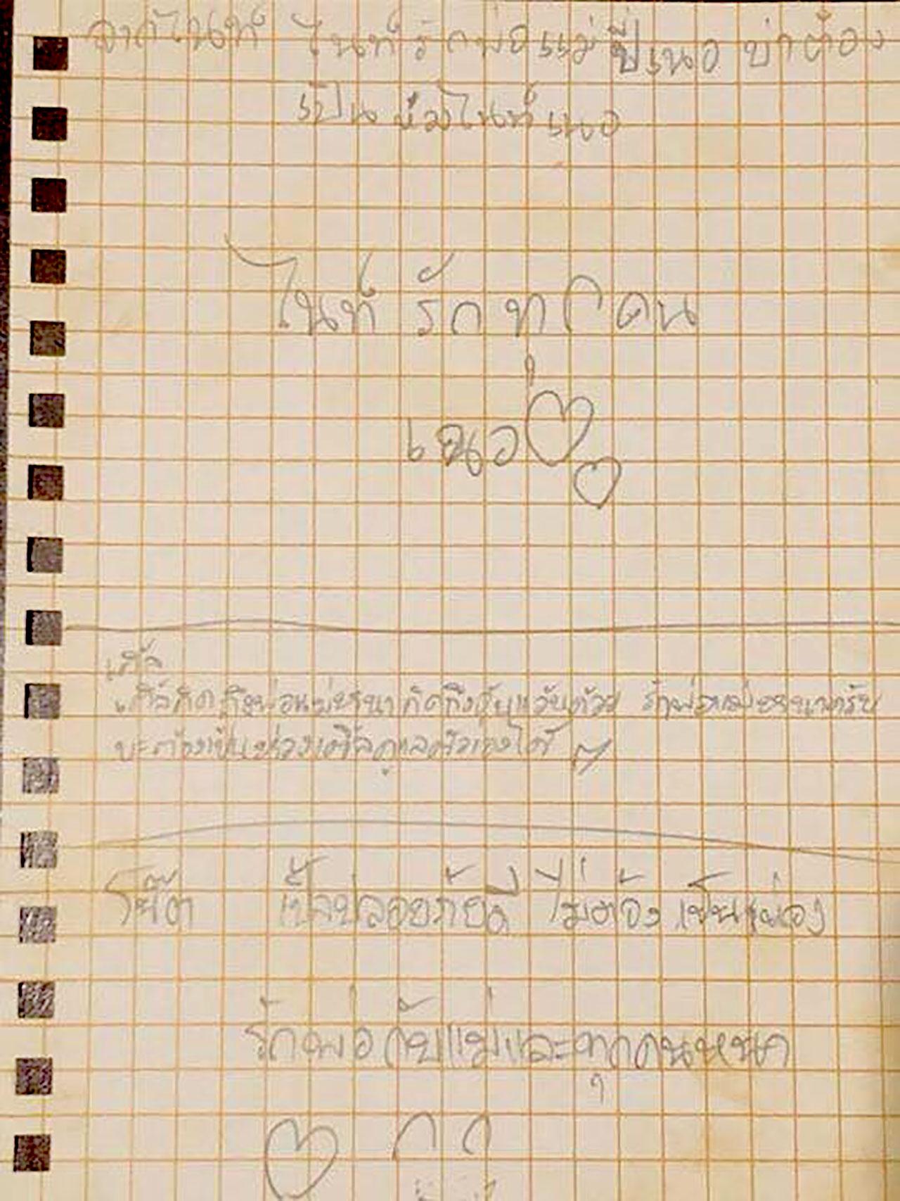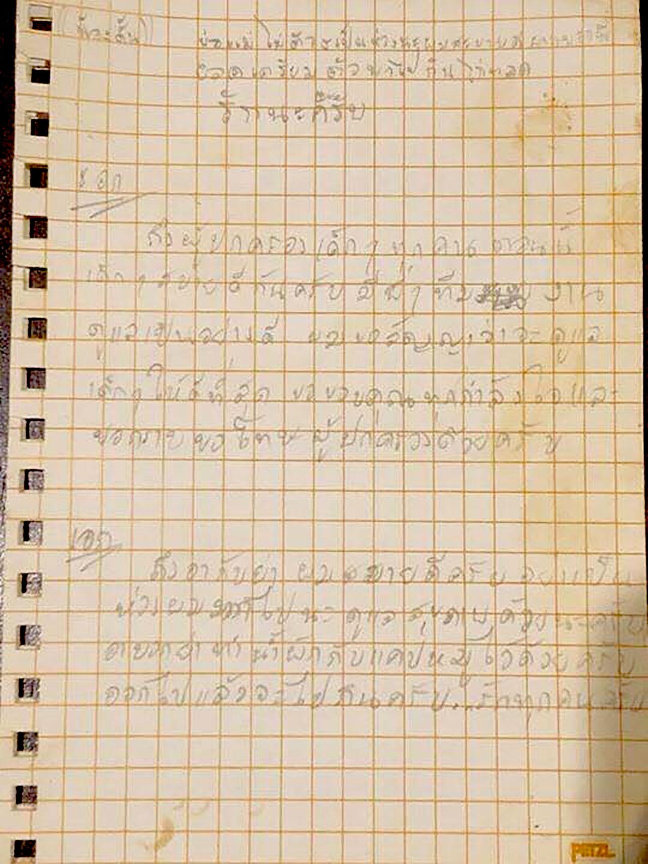 เมื่อวันที่ 7 ก.ค. ผู้สื่อข่าวเปิดเผยจดหมายที่ทีมหมูป่าทั้ง 13 คน เขียนด้วยมือออกมาจากในถ้ำหลวง โดยฝากทีมซีลและนักดำน้ำต่างชาติออกให้ผู้ปกครองและสังคม.