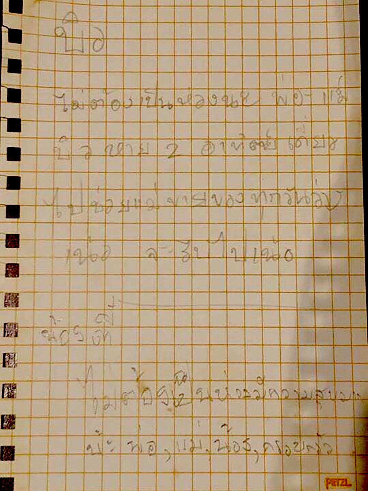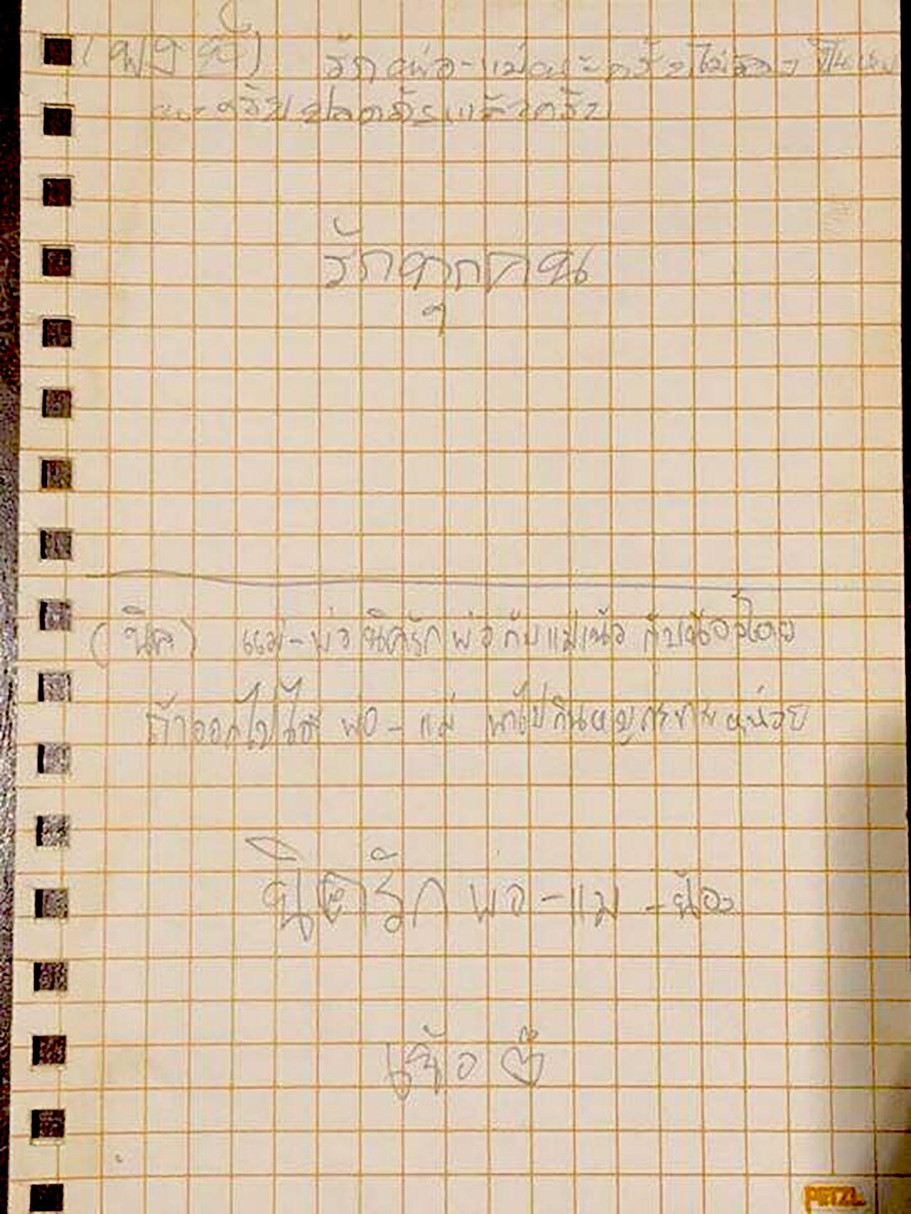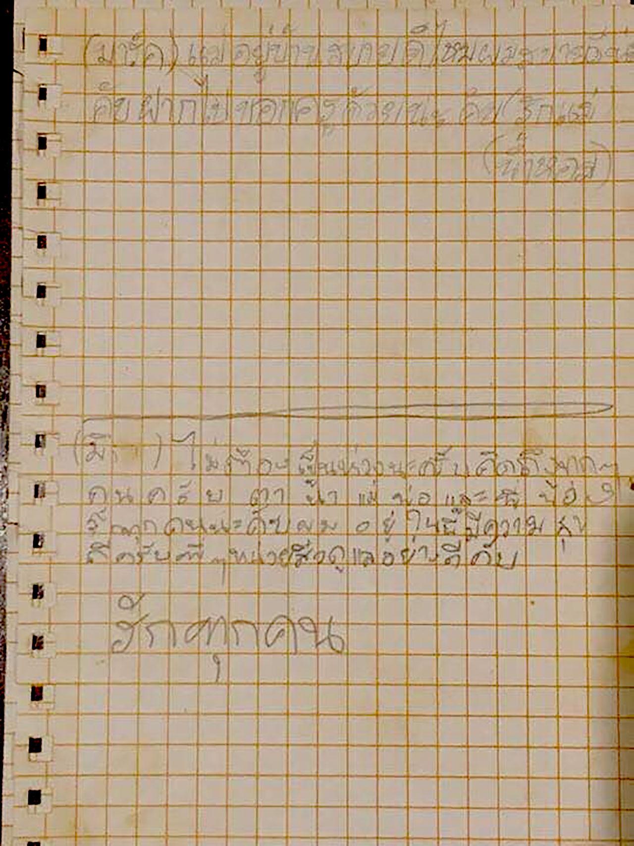 เมื่อวันที่ 7 ก.ค. ผู้สื่อข่าวเปิดเผยจดหมายที่ทีมหมูป่าทั้ง 13 คน เขียนด้วยมือออกมาจากในถ้ำหลวง โดยฝากทีมซีลและนักดำน้ำต่างชาติออกให้ผู้ปกครองและสังคม.
