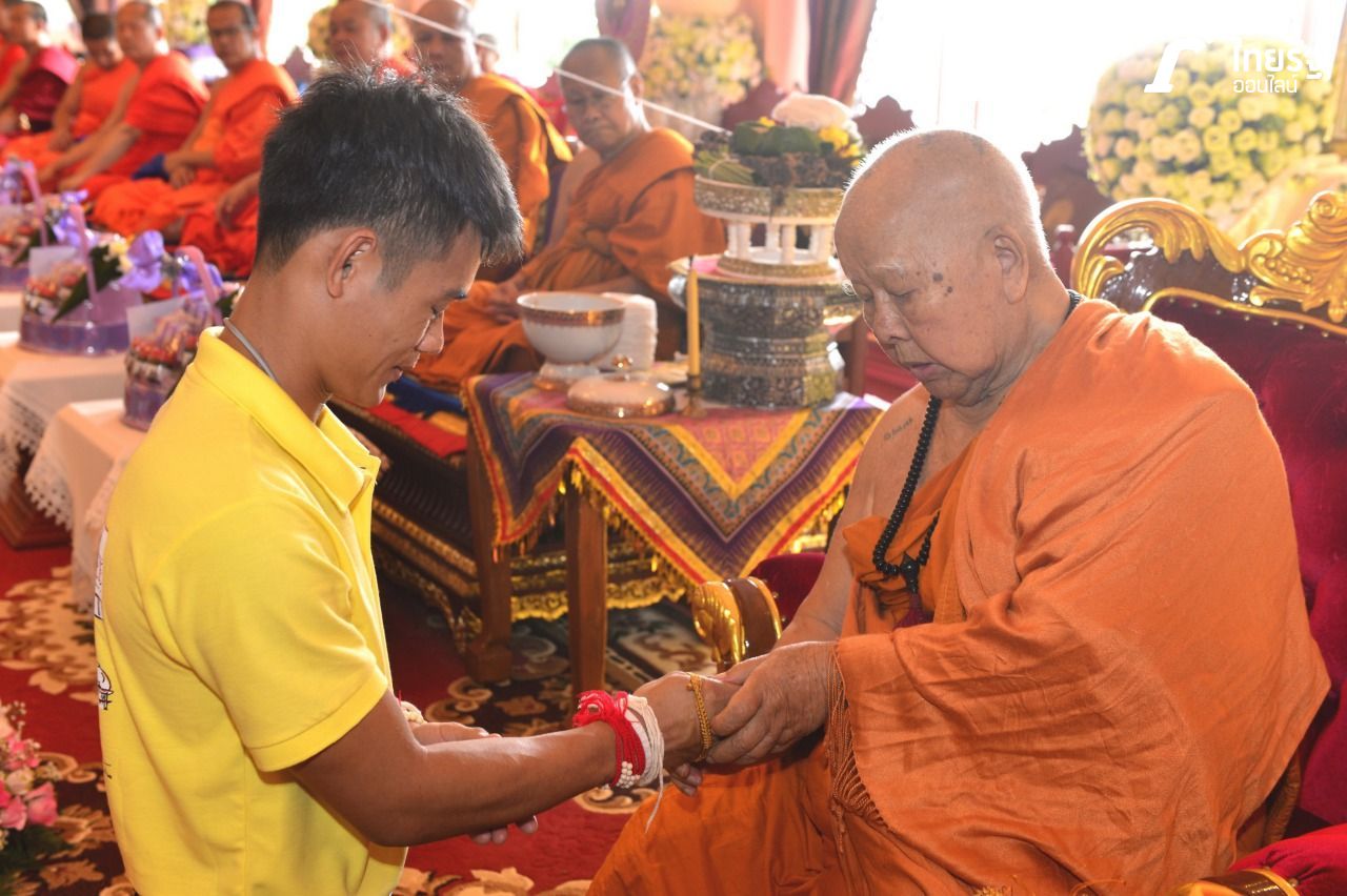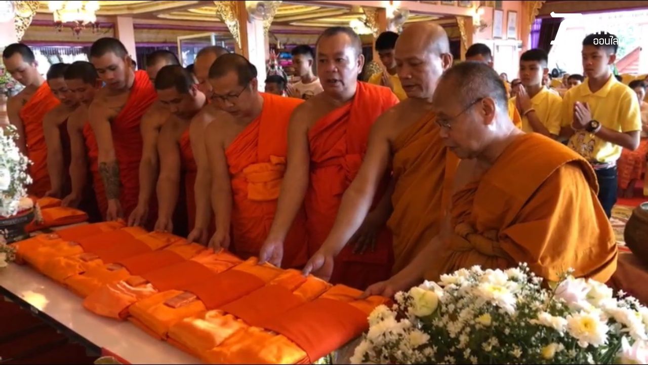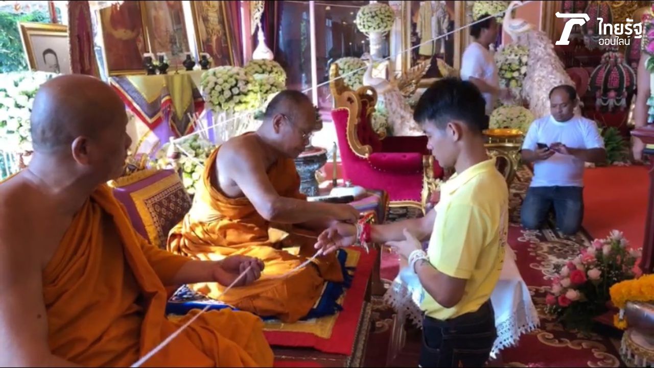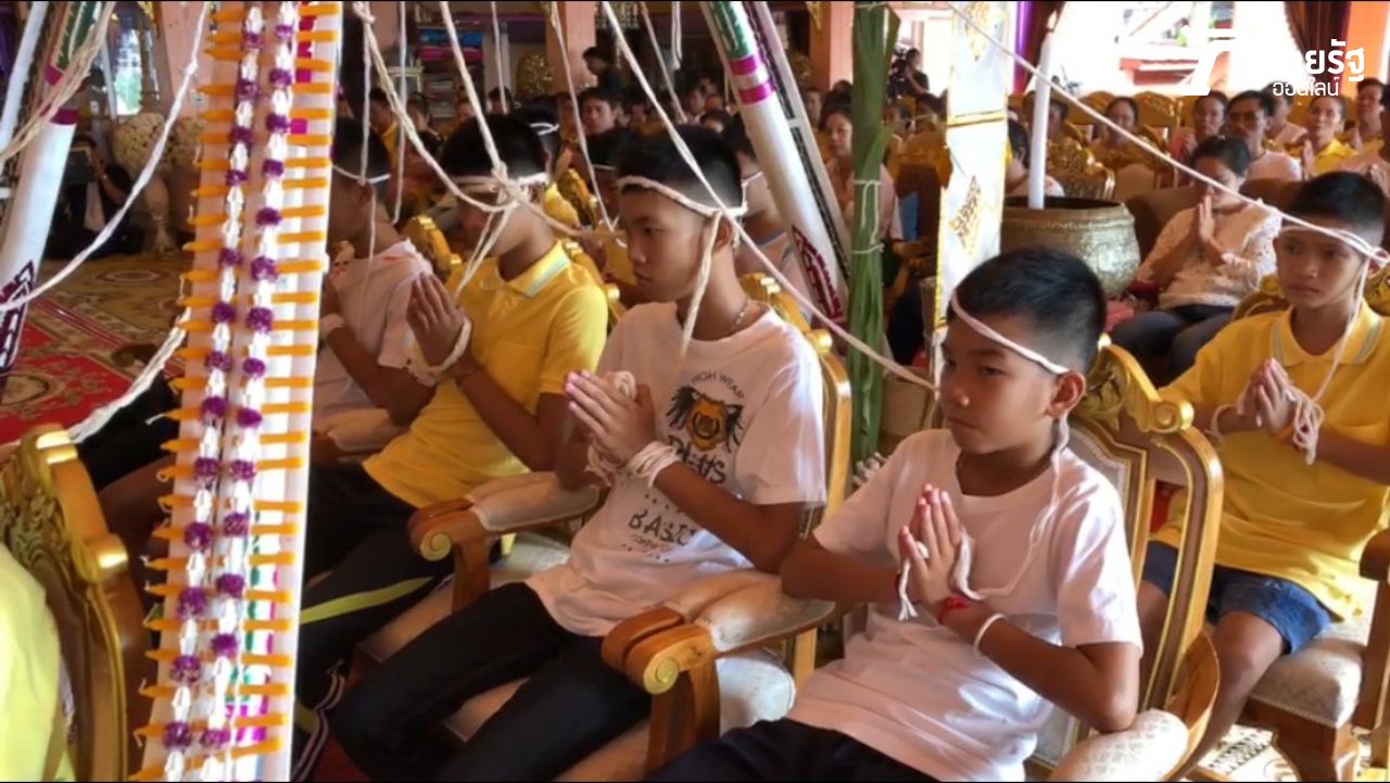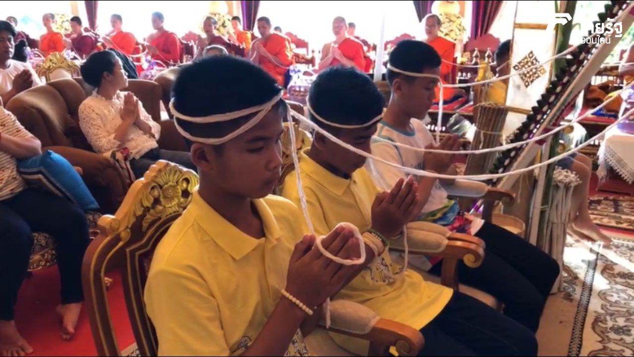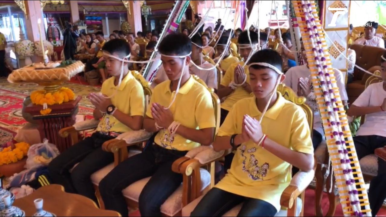 จากนั้นได้โค้ชเอกเป็นผู้จุดเทียนบาตรน้ำมนต์ และเทียนที่ซุ้ม 3 ขา ก่อนพากันใช้ด้ายสายสิญจน์สวมหัวนั่งในซุ่มทำพิธีสืบชะตาบายศรีสู่ขวัญสะเดาะเคราะห์ในเหตุร้ายที่ผ่านพ้นมาตามประเพณีของชาวล้านนา และถวายเครื่องสังฆภัณฑ์แด่พระสงฆ์ 13 รูป ก่อนแยกย้ายกันกลับ ครูบาแสงหล้าได้ประพรมน้ำมนต์และแจกพระแก่หมูป่าทุกคน.