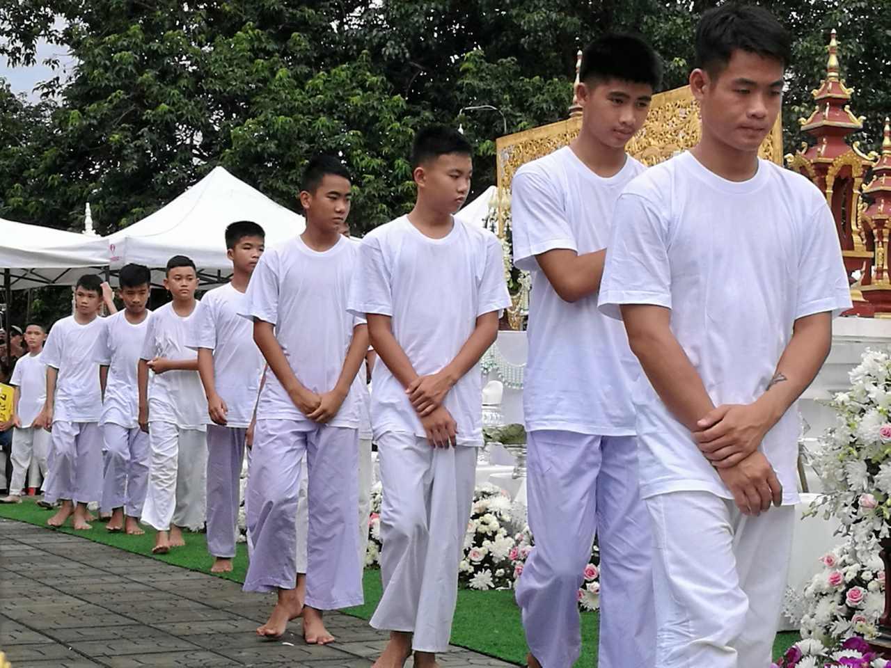 เวลา 16.00 น. วันที่ 24 ก.ค.61 ที่บริเวณลานด้านหน้าพระบรมธาตุดอยเวา วัดพระธาตุดอยเวา อ.แม่สาย จ.เชียงราย พระเทพรัตนนายก เจ้าคณะลำพูน พระรัตนมุณี รักษาการเจ้าคณะจังหวัดเชียงราย พระพุทธิวงศ์ เจ้าคณะอำเภอแม่สาย พระครูประยุต เจติยานุการ รักษาการเจ้าอาวาสวัดพระธาตุดอยเวา และนายประจญ ปรัชญ์สกุล ผู้ว่าราชการจังหวัดเชียงราย นายภาสกร บุญญลักษม์ รอง ผวจ.เชียงราย ปลงผมนาค 12 ทีมหมูป่าทีนทอล์คอะคาเดมี โดยมีผู้ปกครอง ญาติ เพื่อนของน้องๆ และชาวบ้านจากทั้งในจังหวัดเชียงรายและต่างจังหวัดที่เดินทางมาร่วมพิธีจำนวนมาก นอกจากนี้ยังมี ด.ช.อดุลย์ สามออน อายุ 14 ปี หนึ่งในสมาชิกทีมหมูป่าอะคาเดมีที่ติดถ้ำหลวงมาร่วมพิธี แต่ไม่ได้บวช เนื่องจากนับถือศาสนาคริสต์ ได้เดินทางมาร่วมพิธีด้วย