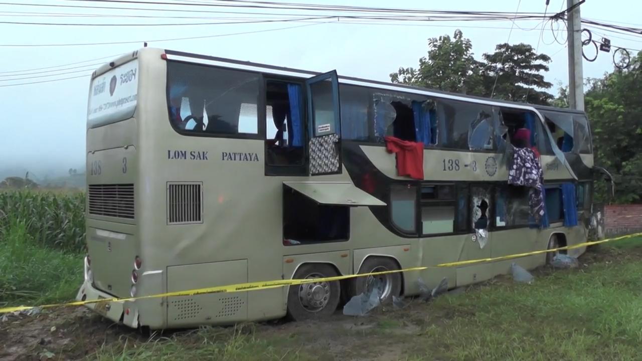 วันที่ 31 ก.ค. 2561 เวลา 04.30 น. ร.ต.อ.สานนท์ จันจินดา พนักงานสอบสวน สภ.เมืองเพชรบูรณ์ ได้รับแจ้งมีอุบัติเหตุรถบัสโดยสารชนเสียหลักลงข้างทาง บริเวณหลักกิโลเมตรที่ 211-212 หมู่ที่ 8 บ้านสะแกงาม ต.บ้านโตก อ.เมือง จ.เพชรบูรณ์ จึงพร้อมด้วยแพทย์เวรโรงพยาบาลเพชรบูรณ์ รุดไปตรวจสอบ