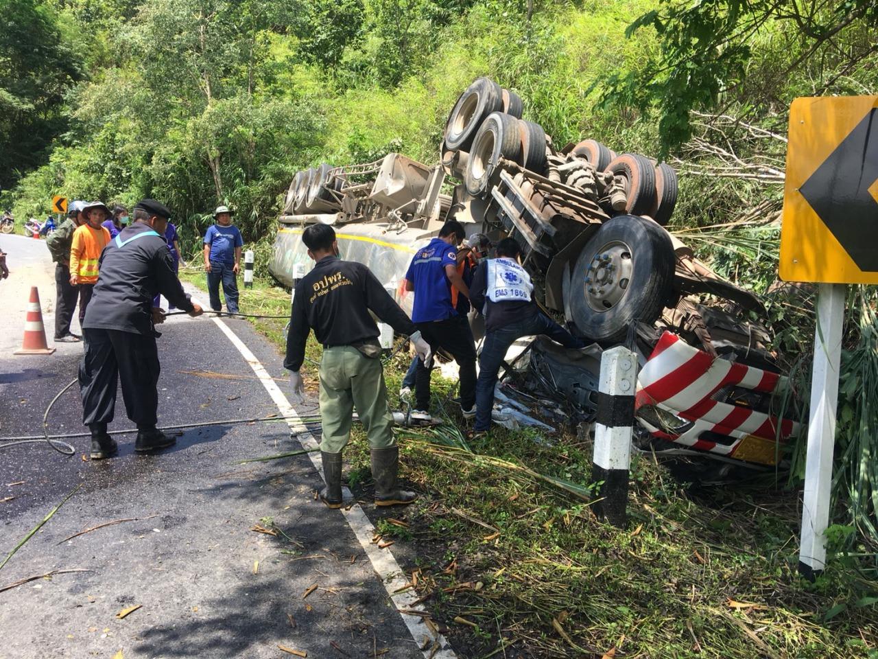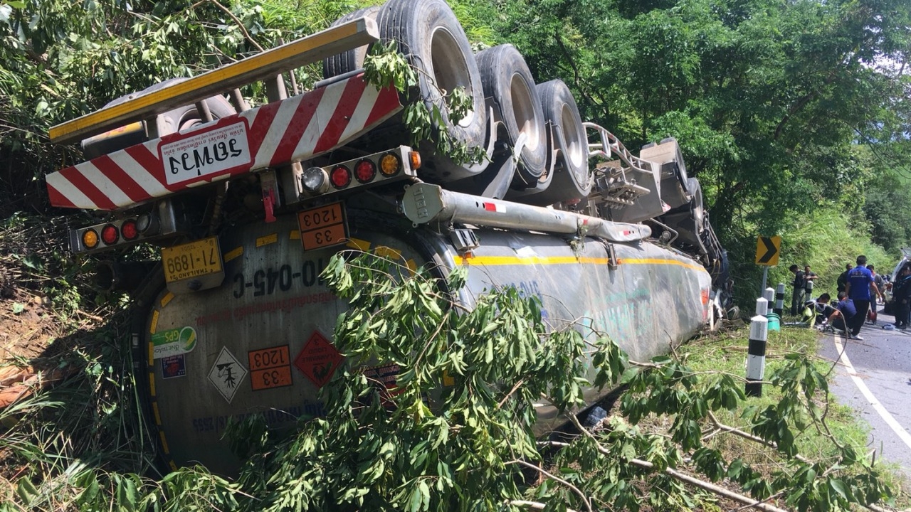รถบรรทุกน้ำมัน 22 ล้อ ที่บรรทุกดีเซลมา 41,000 ลิตร เกิดพลิกคว่ำบนถนนน่าน – เฉลิมพระเกียรติ ที่ห้วยโก๋น คนขับเสียชีวิตคาที่ น้ำมันไหลลงลำห้วยขาม โชคดีไม่มีไฟลุกไหม้...