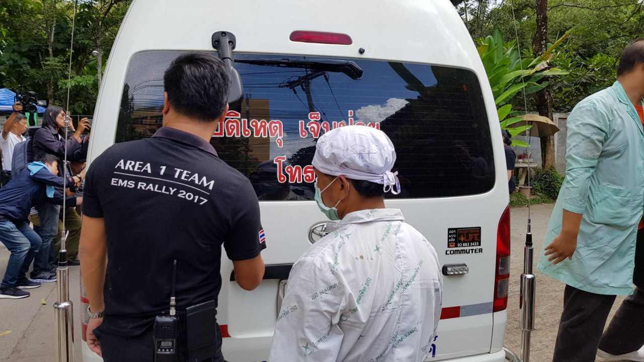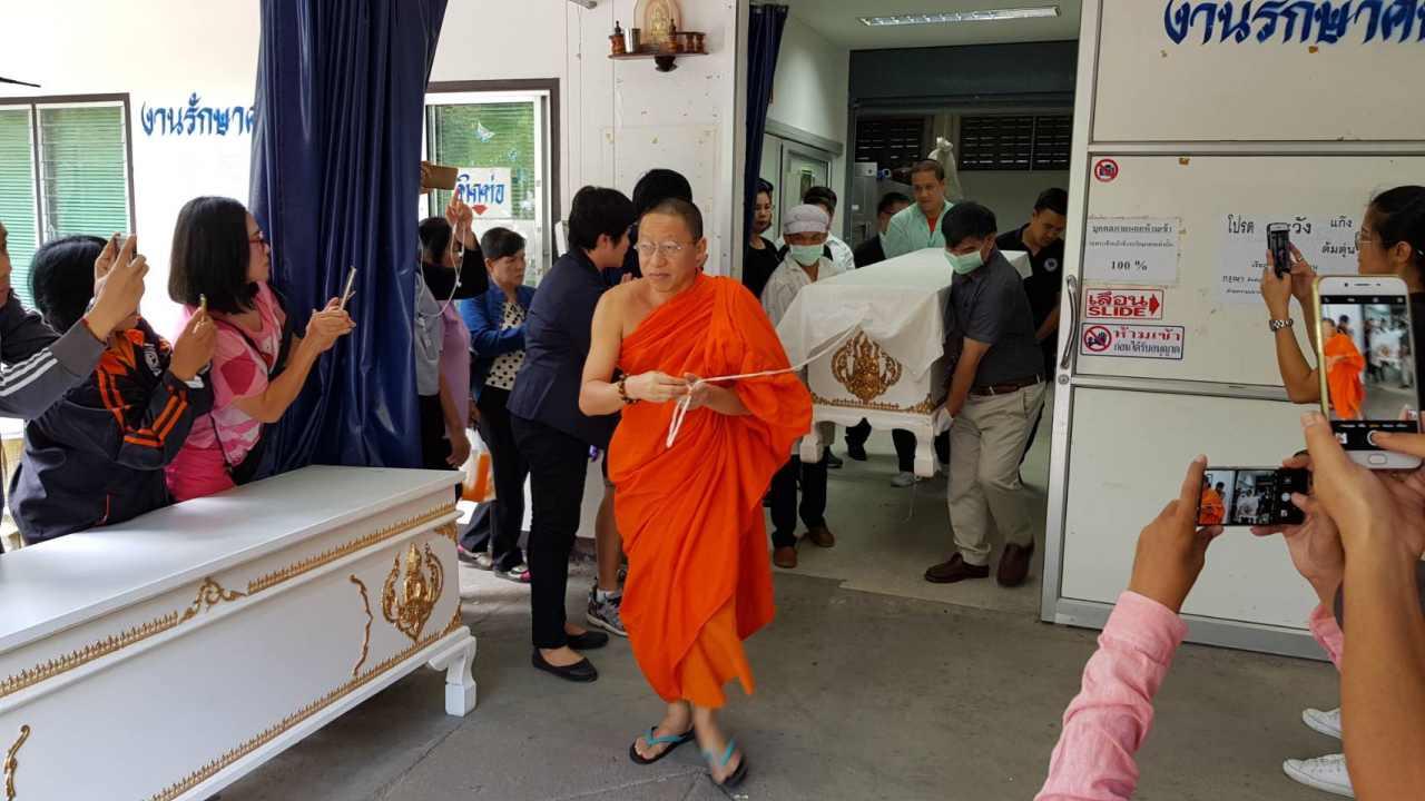 นีโน่ พร้อมญาติ ขอรับศพ โอ ววุฒ ออกจาก รพ.นครพิงค์ ไปตั้งบำเพ็ญกุศลยังวัดพระสิงห์วรมหาวิหาร จ.เชียงใหม่ ขึ้นนั่งในรถตู้ข้างโลงศพน้องรัก ไปส่งถึงวัด