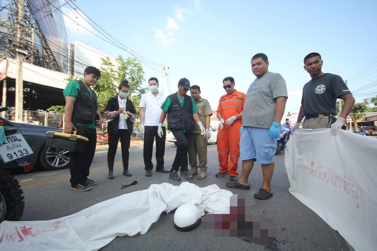 เมื่อเวลา 16.00 น. วันที่ 9 ต.ค.61 พ.ต.ต.นพภณ ปัณวรากร สารวัตรเวร สภ.ช้างเผือกเมืองเชียงใหม่ ได้รับแจ้งว่ามีอุบัติเหตุรถจักรยานยนต์แฉลบล้มเองมีรถสองแถวขับตามหลังมาทับซ้ำจนเสียชีวิต บริเวณทางโค้งก่อนถึงหน้าร้านที่นอนปีนัง ถ.อัษฎาธร ต.ช้างเผือก จึงพร้อมกับ แพทย์ รพ.มหาราชนครเชียงใหม่ และเจ้าหน้าที่มูลนิธิรวมใจ อป.พร.อ.เมือง เชียงใหม่ รุดไปสอบสวน พบรถจักรยานยนต์ยี่ห้อฮอนด้า แบบวิบากสีเขียว ไม่ติดทะเบียนแฉลบล้มอยู่กลางถนน พบศพ น.ส.ณัฐพิมล พรหมวงศ์ศา อายุ 51 ปี ชาวบ้าน ถนนบำรุงราษฎร ซอย 4 ต.วัดเกตุ อ.เมือง เชียงใหม่ นอนเสียชีวิตอยู่ สภาพศพถูกล้อรถทับศีรษะยุบเสียชีวิตคาที่