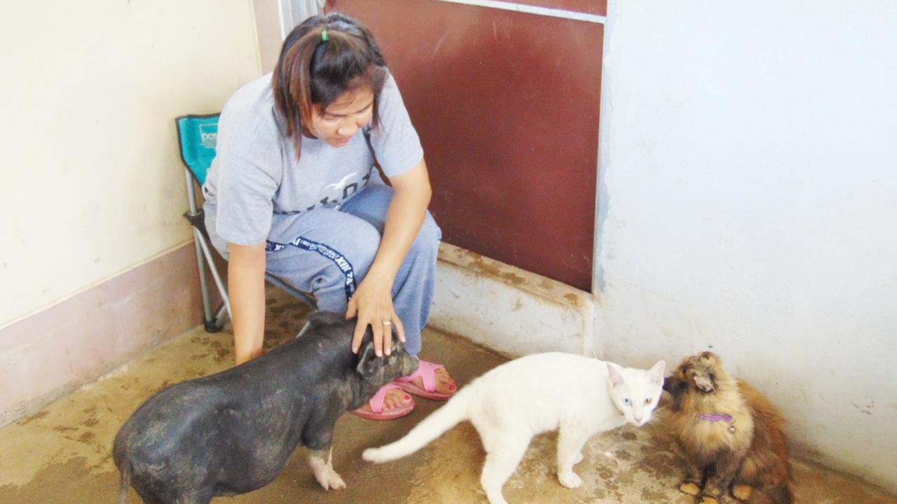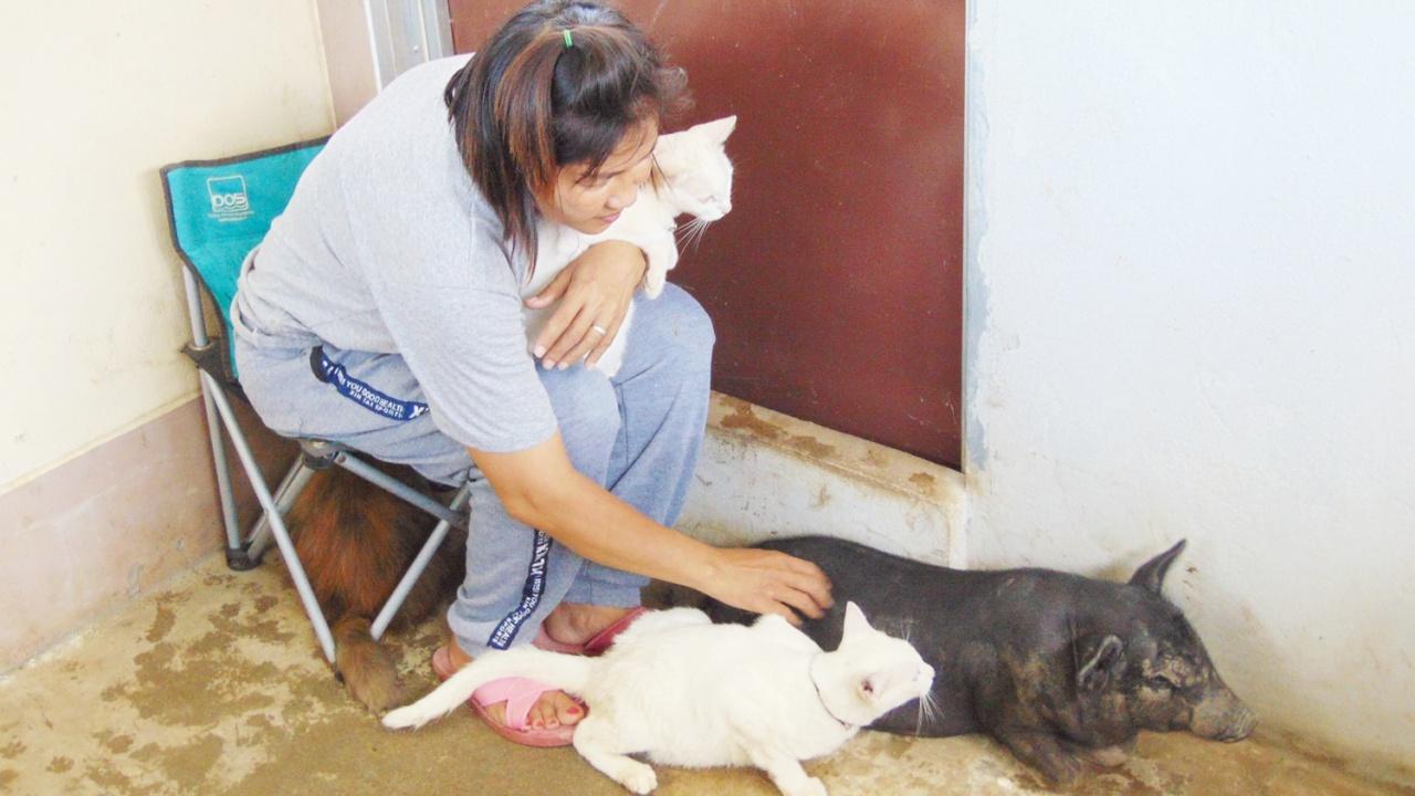 ผู้สื่อข่าวเดินทางไปที่บ้านเลขที่ 245/10 ม.2 ต.บ้านกล้วย อ.เมือง จ.สุโขทัย ซึ่งด้านหน้าเปิดเป็นร้านเสริมสวยของ น.ส.มานิชา เอมสอน อายุ 42 ปี หลังทราบว่าเป็นเจ้าของแมวไทยพันธุ์ขาวมณี เพศผู้ อายุประมาณ 2 ปี ชื่อ "เมฆ" และลูกหมูแม้ว เพศผู้ อายุ 3 เดือน ชื่อ "เรกะติ" ซึ่งมีความรักความผูกพันกันเหมือนพี่น้อง เวลา "พี่เมฆ" จะเดินไปไหน "เจ้าเรกะติ" ก็จะเดินตามคลอเคลียตลอด นับเป็นความรักของสัตว์ต่างสายพันธุ์ที่สุดแสนประทับใจต่อผู้พบเห็น