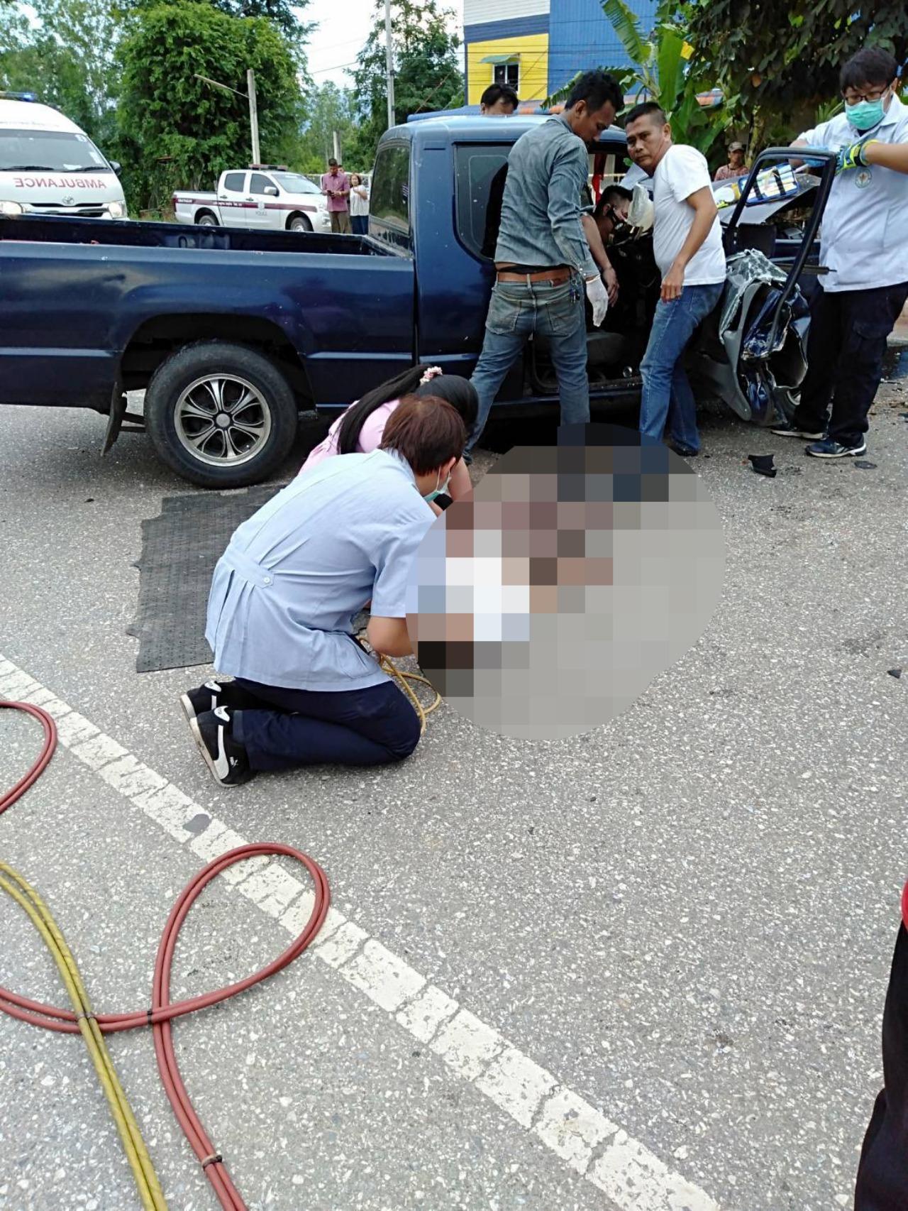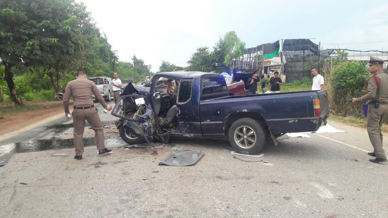 ที่เกิดเหตุเป็นถนน 2 ช่องจราจรวิ่งสวนกัน มีรถยนต์กระบะยี่ห้ออีซูซุ สีน้ำตาล ทะเบียน บง 1464 พิษณุโลก และรถยนต์กระบะยี่ห้อมิตซูบิชิ สีน้ำเงิน ทะเบียน บต 4025 แพร่ สภาพเสียหายพังยับเยิน จอดนิ่งอยู่บนถนนทั้งสองคัน มีผู้ได้รับบาดเจ็บถูกอัดก๊อบปี้ติดคาซากรถกระบะมิตซูบิชิ 2 ราย สภาพแขนขาหักผิดรูปทั้งสองราย โดยเป็นเจ้าหน้าที่ตำรวจของ สภ.ชาติตระการ เจ้าหน้าที่กู้ภัยใช้เครื่องมือตัดถ่างช่วยออกมา แต่ผู้บาดเจ็บเสียชีวิตในที่เกิดเหตุ 1 รายคือ ร.ต.ท.สงกรานต์ บุญซ้อน รอง สว.(ป.) สภ.ชาติตระการ ส่วนอีก 1 รายไปเสียชีวิตที่โรงพยาบาลชาติตระการ คือ พ.ต.ท.อนุศิษฏ์ ปารมีวิศิษฐ์ รอง ผกก.(สอบสวน) สภ.ชาติตระการ