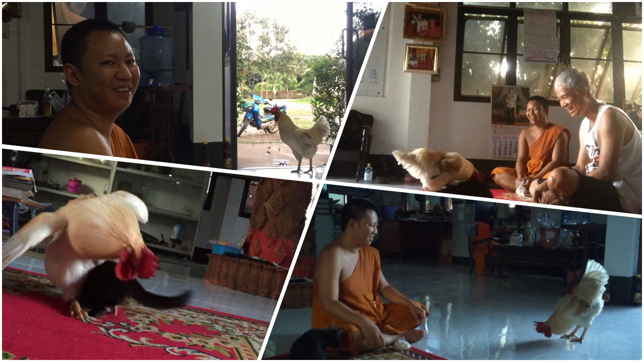 พระทศพร ถาวรปญโญ หรือ(ตุ๊อ๊อป) เจ้าอาวาสวัด กล่าวว่า ที่วัดได้เลี้ยงสัตว์มีสุนัข แมว ไก่ โดยการเลี้ยงให้อาหารในถาดเดียวกันกินด้วยกันอยู่ด้วยกันโดยที่ไม่ทำร้ายกันซึ่งสัตว์ที่อยู่ในวัดได้เลี้ยงเองตั้งแต่ตัวเล็กๆ จนโต สำหรับไก่อูเพศผู้ มีญาติโยมนำมาถวายตั้งแต่ตัวเล็กๆ และเลี้ยงมาจนโตตั้งชื่อว่าแก้ว ตอนนี้อายุ 1 ปี จะเลี้ยงและอยู่ควบคู่กับสุนัข แมว และไก่จะมีนิสัยชอบเล่นกับแมว และสุนัข ตลอดเวลาแต่ที่เล่นสนิทสนมกันมาก็มักจะเล่นกับแมว และตนเองก็เกิดปีไก่ และได้เลี้ยงไก่แก้ว เชื่อว่าเป็นเพื่อนคู่บุญบารมีมาอยู่ด้วยกันที่วัด และยังเป็นเพื่อนคลายเหงาได้ด้วยและสัตว์ที่เลี้ยงไว้ในวัดจะฉลาดกันทุกตัว