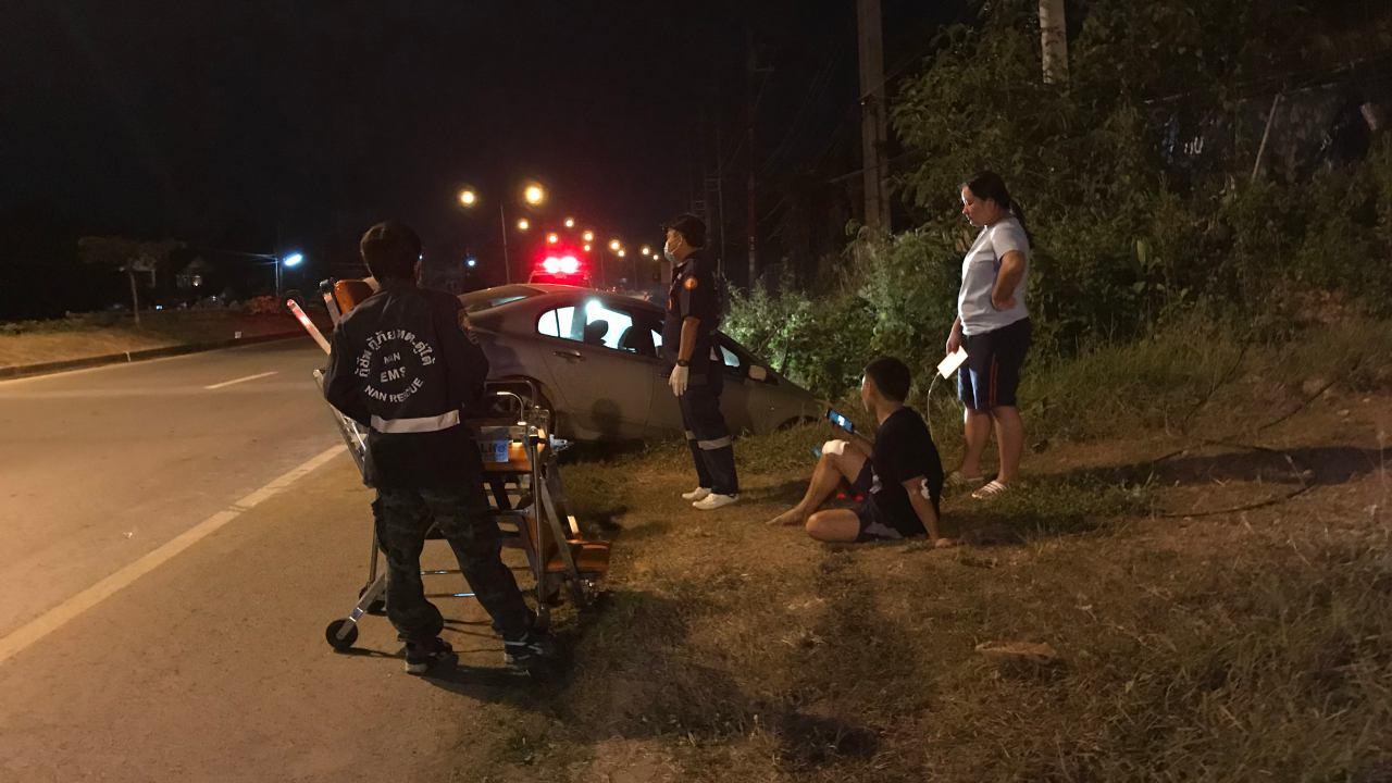 เมื่อกลางดึกของวันที่ 22 พ.ย. 61 ร.ต.อ.ธณัชพงค์ ปัญญานะ พงส.สภ.เมืองน่าน ได้รับแจ้งจากศูนย์วิทยุนันทบุรี ว่า มีเหตุรถเก๋งเสียหลักชนร่องน้ำข้างทาง บนถนนยันตรกิจโกศลก ม.ที่ 10-11 ขาเข้าในเมืองน่าน