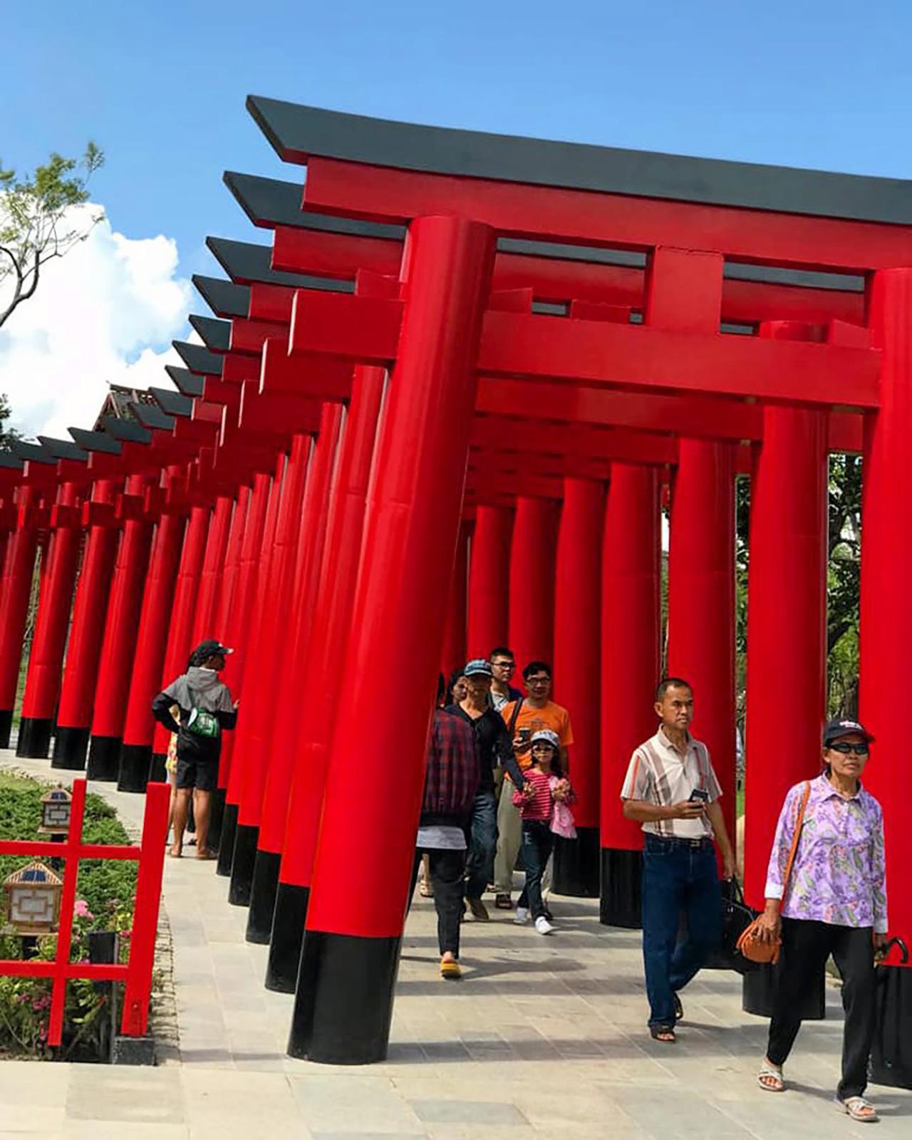 คุณตี๋ เล่าว่า จุดเด่นสำคัญๆของฮิโนกิ แลนด์ คือเมื่อเข้ามาถึงด้านหน้าโครงการ จะพบกับซุ้มประตูโคมแดงขนาดใหญ่จำลองมาจากซุ้มประตูคามินาริมง หรือฟุไรจิน–มง จากวัดอาซากุสะ ซึ่งใต้โคม แดงนั้นมีประติมากรรมมังกรแกะสลัก และเมื่อเดินผ่านซุ้มประตูมา ก็จะเจออุโมงค์เสาโทริอิ (Torii Gate) จำลองมาจากศาลเจ้า Fushimi Inari Taisha (ฟูชิมิ อินาริ) หรืออีกชื่อหนึ่งว่าศาลเจ้าจิ้งจอก เป็นศาลเจ้าที่มีชื่อเสียงโด่งดังของเกียวโต