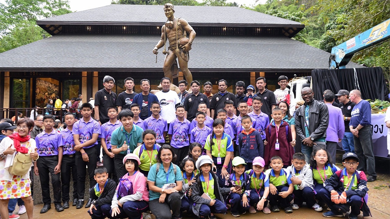 13 หมูป่าอะคาเดมีถ่ายรูปร่วมกับนายเฉลิมชัย โฆษิตพิพัฒน์ ศิลปินแห่งชาติ พร้อมทีมงาน หลังสร้างรูปหล่อโลหะ “จ่าแซม” น.ต.สมาน กุนัน ตั้งเป็นอนุสาวรีย์ “ฮีโร่ถ้ำหลวง” ที่ถ้ำหลวง-ขุนน้ำนางนอน จ.เชียงราย พร้อมปรับปรุงเป็นแหล่ง ท่องเที่ยว.