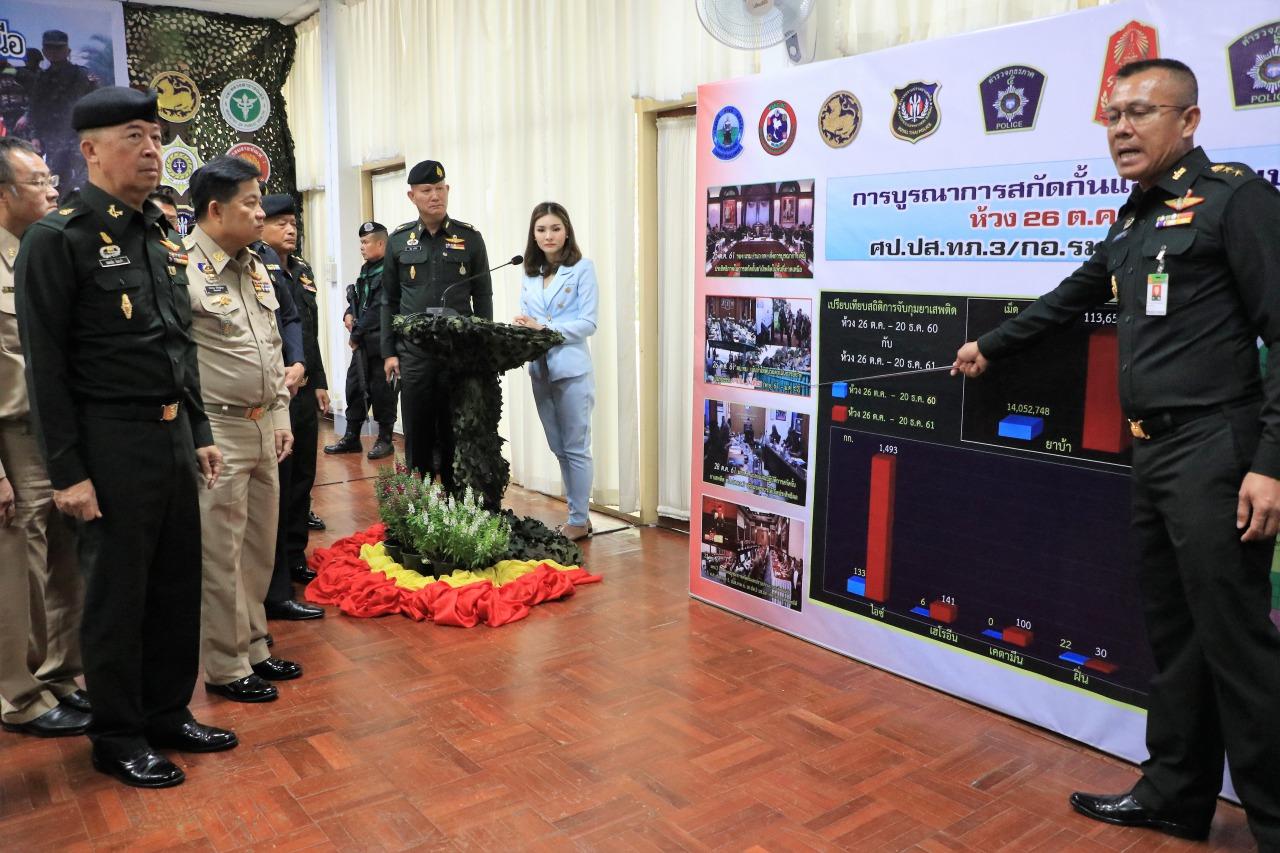 เมื่อวันที่ 20 ธ.ค.61 ที่สโมสรค่ายเม็งรายมหาราช จ.เชียงราย พล.ท.ฉลองชัย ชัยยะคำ แม่ทัพภาค 3 นายประจญ ปรัชญ์สกุล ผวจ.เชียงราย บก.ปส.3 ปปส. ตำรวจภาค 5-6 ร่วมแถลงผลการปราบปรามยาเสพติดพื้นที่กองทัพภาค 3 ในรอบ 3 เดือน จากความร่วมมือบูรณาการ ระหว่างทหารตำรวจ ฝ่ายปกครอง ป.ป.ส.ออกสกัดกั้นยาเสพติดพื้นที่ชายแดนและพื้นที่ชั้นใน ระหว่างวันที่ 26 ต.ค.-20 พ.ย.61 ผลการกวาดล้างพื้นที่ชั้นใน สามารถจับกุมยาบ้าได้ 29,593,069 เม็ด ยาไอซ์ 607,50 กก. เฮโรอีน 71,27 กก.สำหรับพื้นที่ชั้นในสามารถจับยาบ้าได้ 88,062,694 เม็ด ยาไอซ์ จำนวน 885,87 กก. เฮโรอีน จำนวน 70,03 กก. รวมผลการปฏิบัติงานสามารถยึดยาบ้าได้ 113,655,762 เม็ด ยาไอซ์ 1,493,37 กก. เฮโรอีน 140.30 กก. รวมมูลค่าทั้งหมดกว่า 2 พันล้านบาท