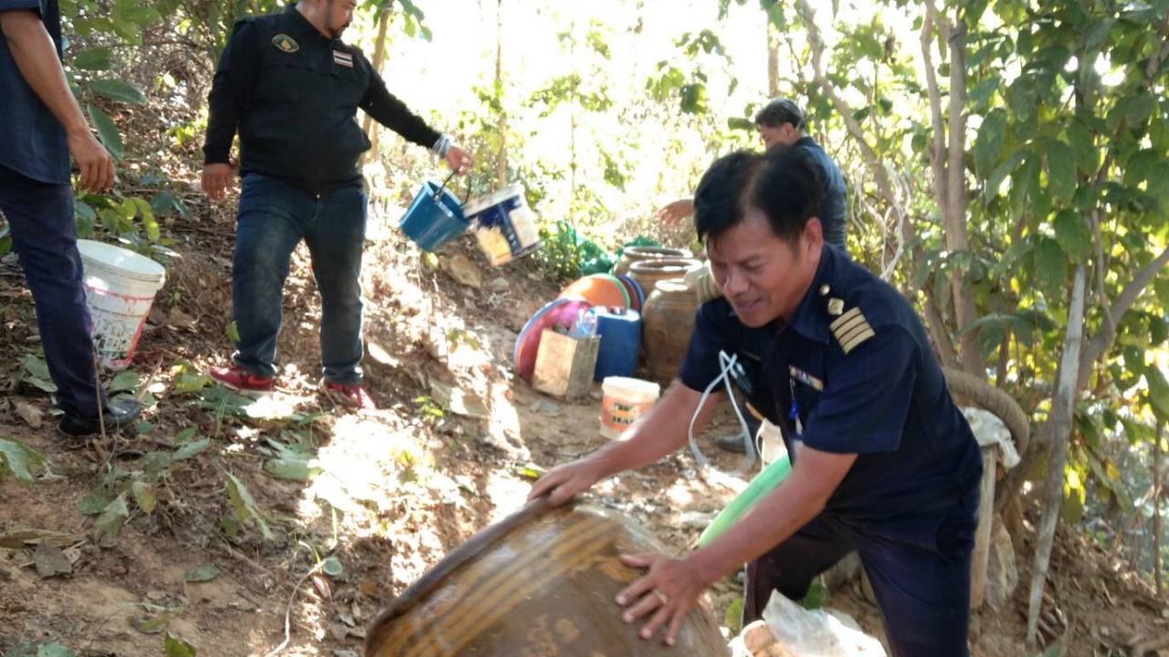 เมื่อเดินทางถึงบริเวณป่าละเมาะกลางทุ่งนาดังกล่าว พบหญิงสูงวัย ทราบชื่อภายหลังคือ นางอำนวย ด้วงทอง อายุ 61 ปี อยู่บ้านเลขที่ 377 หมู่ 4 ต.ดงคู่ อ.ศรีสัชนาลัย จ.สุโขทัย กำลังนั่งดูแลการกลั่นสุราเถื่อนผ่านอุปกรณ์เครื่องกลั่นจำนวนมากในบริเวณดังกล่าว โดยพบของกลางคือ โอ่งมังกรขนาดใหญ่บรรจุสุราแช่ขนาด 100 ลิตร จำนวน 10 ใบ เครื่องกลั่นผลิตสุราขนาดบรรจุ 200 ลิตร พร้อมอุปกรณ์การกลั่น 1 ชุด สุรากลั่นบรรจุถังรวมจำนวน 100 ลิตร เจ้าหน้าที่จึงเข้าทำการจับกุมเพื่อดำเนินการกฎหมาย